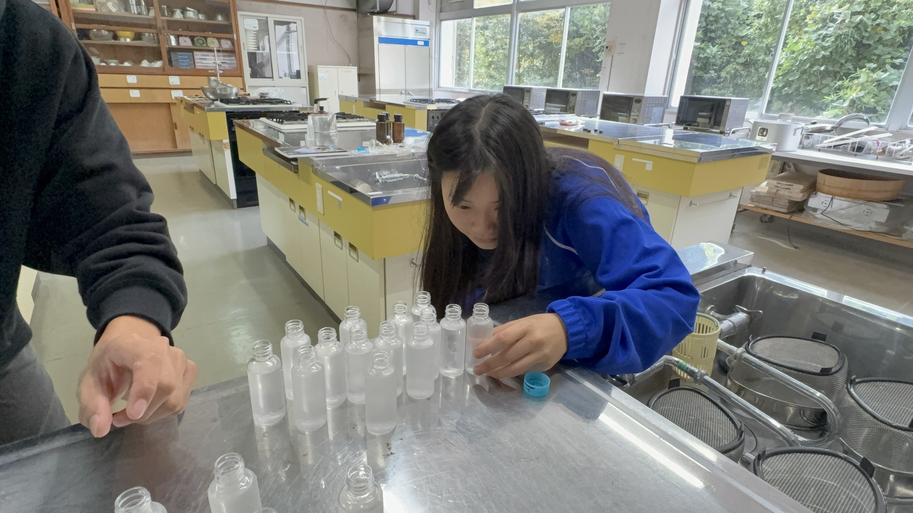 杉の蒸留水を、スプレーボトルに詰めている