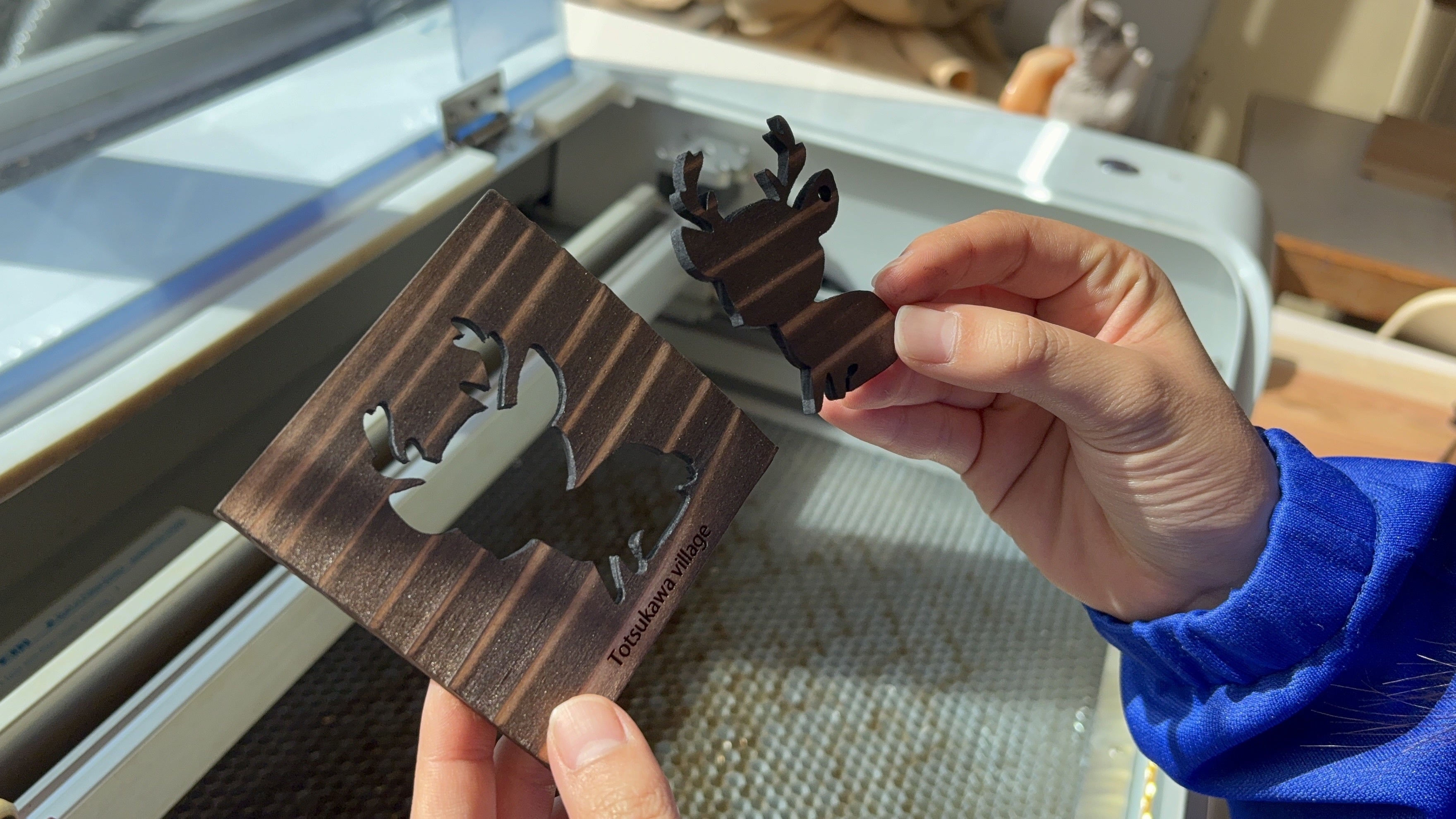 木材をバーナーであぶって焼木を作り、その焼木をレーザーでシカの形にくり抜いた