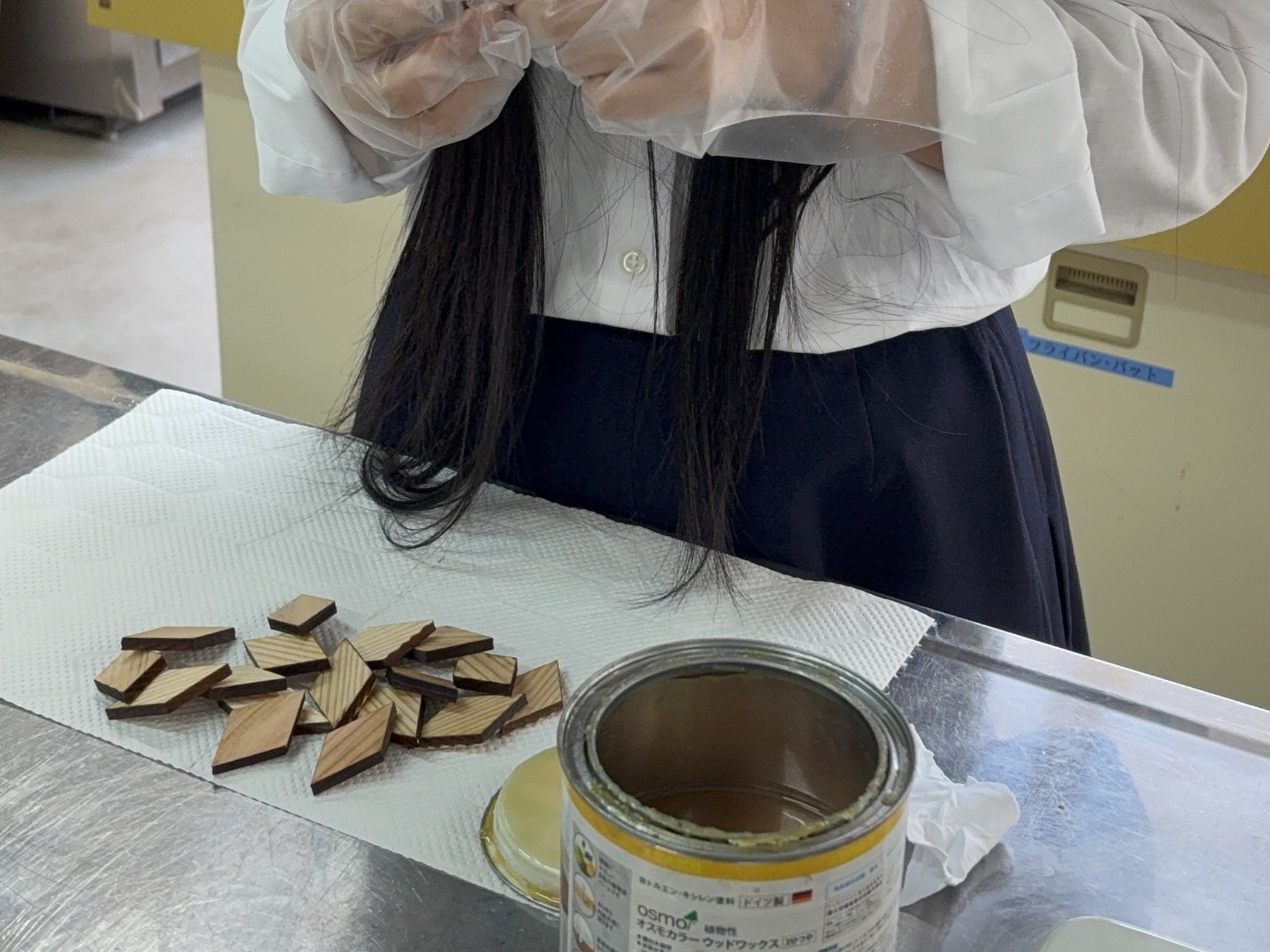 パーツを接着し、寄木コースターを作っている