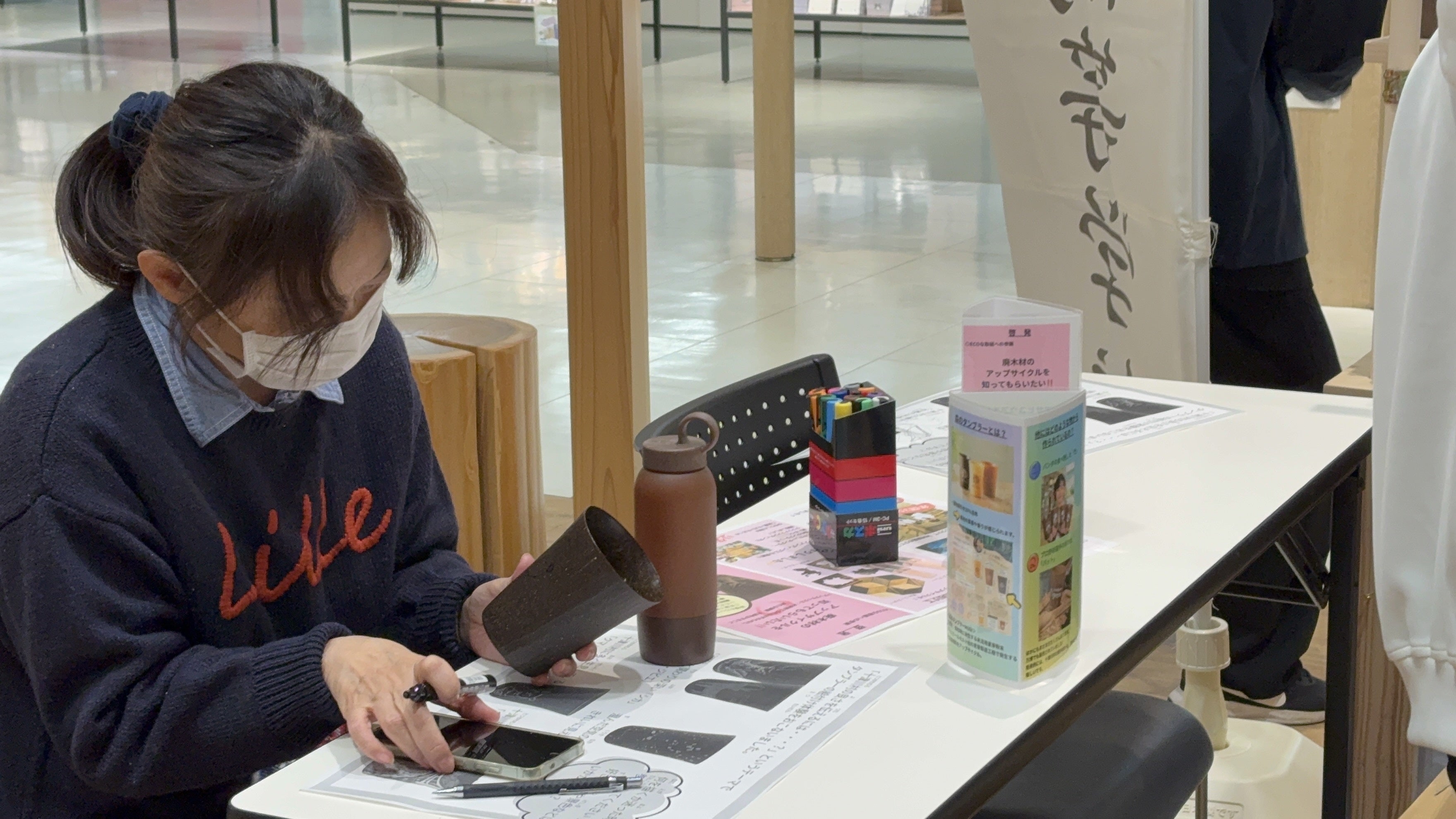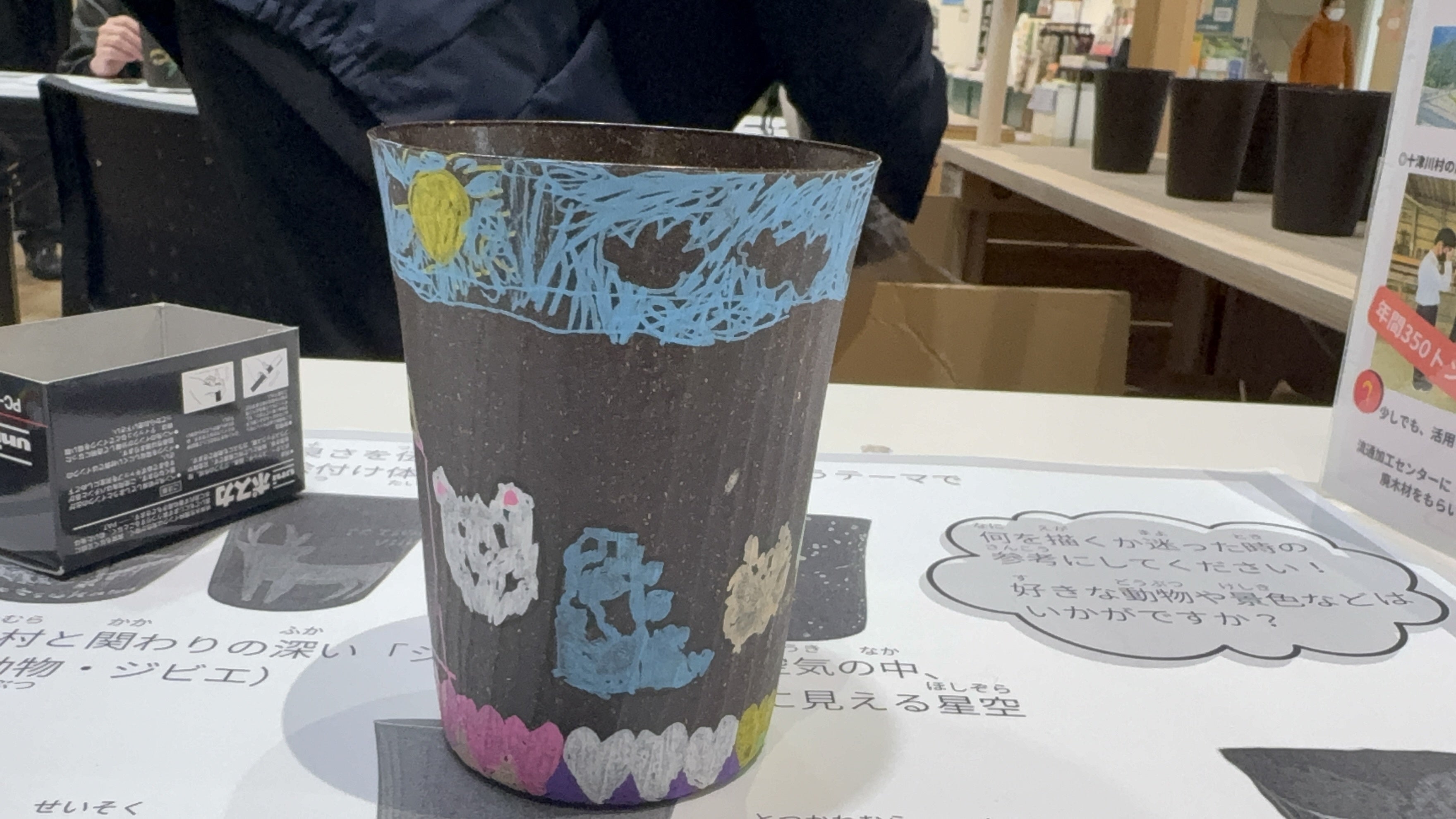 捨てられるはずだった麦芽やヒノキから作られた、「森のタンブラー」や「森のマイボトル」に、絵を描いてもらい、世界に一つのタンブラーを作ってもらいました!