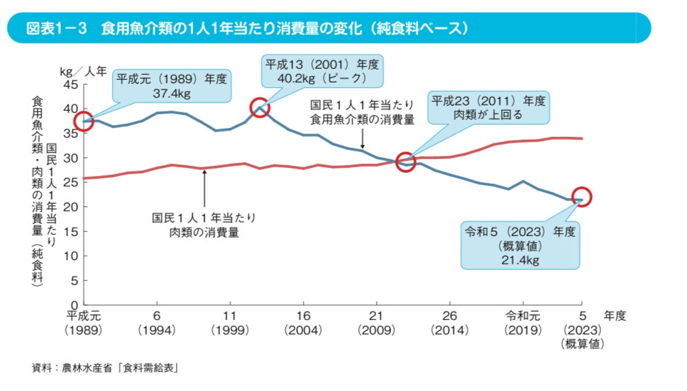 水産庁の統計によると、日本人1人1年あたりの魚の消費量は毎年の統計で過去最低を更新し続けており、日本の食卓から魚がどんどん離れている状況です。
