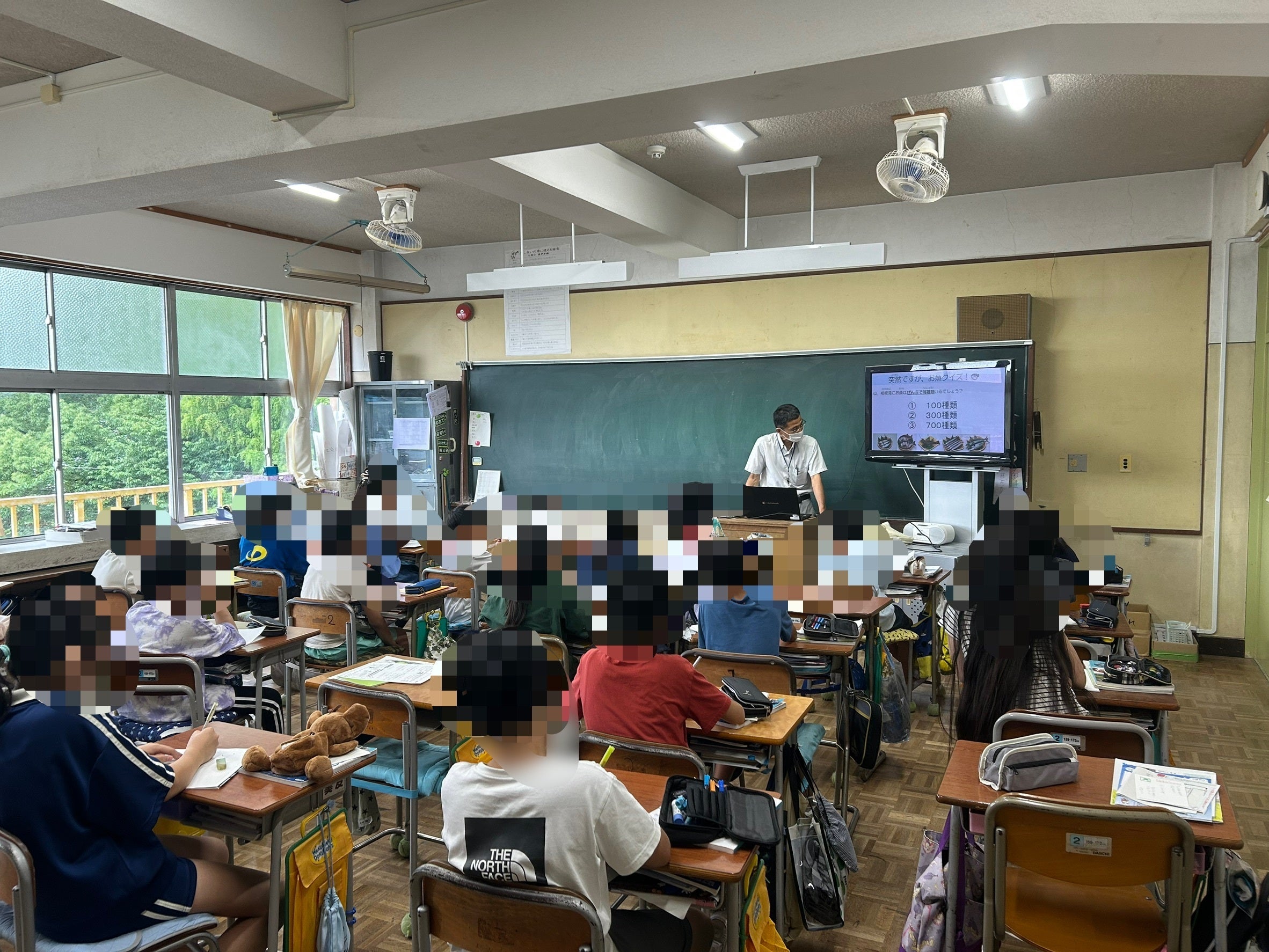 小学校での授業。クイズを交えながら小田原の魚について説明している。