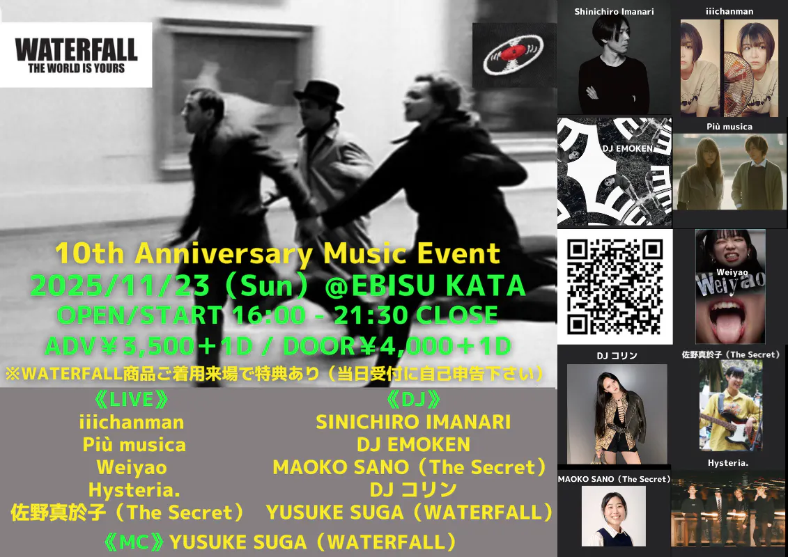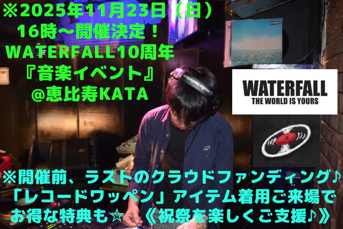 現段階で言えることはWATERFALL10周年ということで今までにやった周年イベントとは規模もグレードアップした内容になることは間違いないです(皆様の支援次第で大きさ決まる)。ディケイドをしっかり嚙み締めれる企画をできたらと思ってます。今から開催が待ち遠しいですね。皆さんの楽しそうな笑顔に会えるのを楽しみにしています。また既に+これからご出演頂けるアーティスト様、場所を運営しておられる恵比寿リキッド/KATA/TIME OUTの皆様には感謝でございます。その感謝をWATERFALLユーザーの方々、これから知って下さる・ご愛用下さる皆様にも還元できればという思いです。乞うご期待頂ければ幸いです。