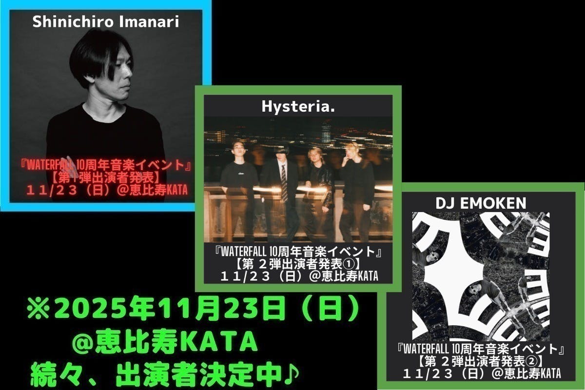 現段階で言えることはWATERFALL10周年ということで今までにやった周年イベントとは規模もグレードアップした内容になることは間違いないです(皆様の支援次第で大きさ決まる)。ディケイドをしっかり嚙み締めれる企画をできたらと思ってます。今から開催が待ち遠しいですね。皆さんの楽しそうな笑顔に会えるのを楽しみにしています。また既に+これからご出演頂けるアーティスト様、場所を運営しておられる恵比寿リキッド/KATA/TIME OUTの皆様には感謝でございます。その感謝をWATERFALLユーザーの方々、これから知って下さる・ご愛用下さる皆様にも還元できればという思いです。乞うご期待頂ければ幸いです。