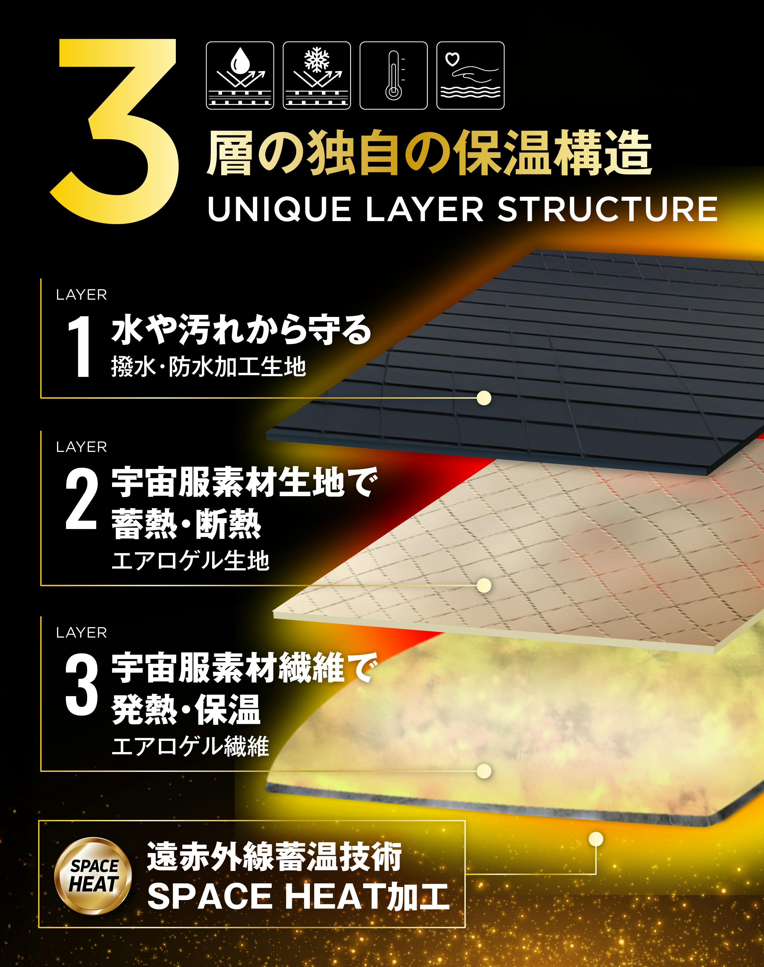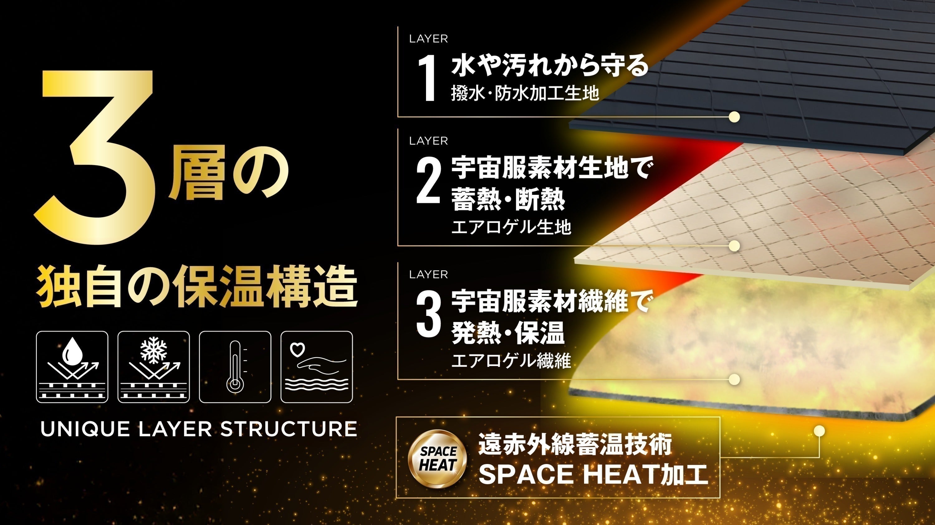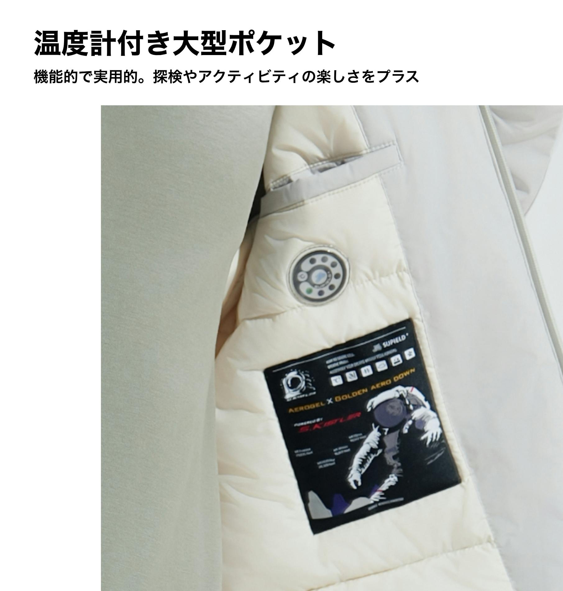 今回ご紹介させていただくのは厚さ2mmで-196℃を断熱する宇宙服素材「エアロゲル生地」、最新素材「S・KISTLER®エアロゲル綿」、遠赤外線蓄暖技術「SPACE HEAT」の最新3大要素を組み合わせ、冬の寒さを快適に乗り切るエアロゲルジャケット「WARM JACKET V2 」です!