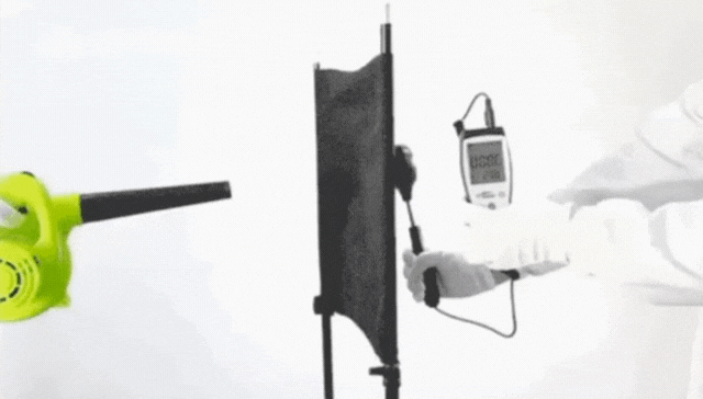 ※上記の実験は、エアジャケット表面生地の防風性を検証するためのものです。