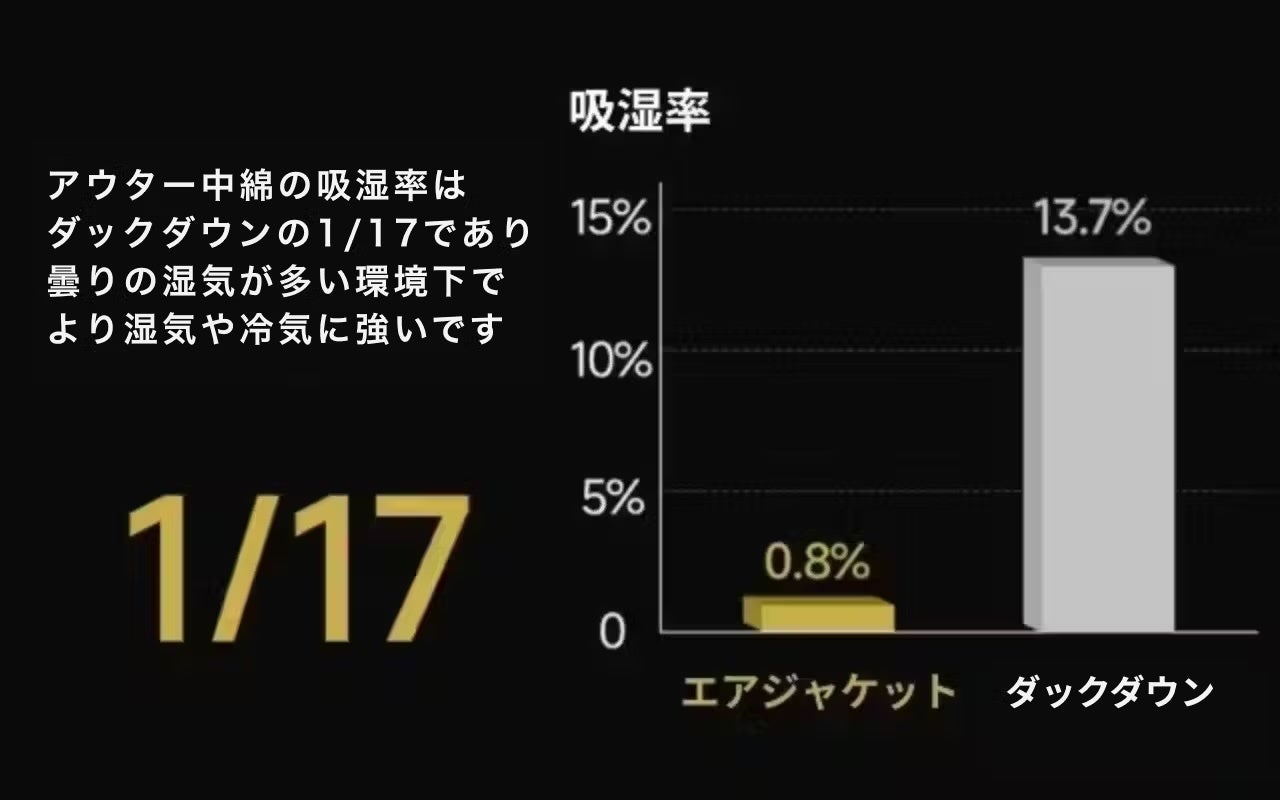 エアロゲル中綿は動物繊維を使わず細菌の繁殖を抑え、ダックダウン特有の臭いもないです。さらに吸湿率がダウンのわずか1/17に過ぎず、湿気が多い環境下でも驚くほど暖かく快適です!