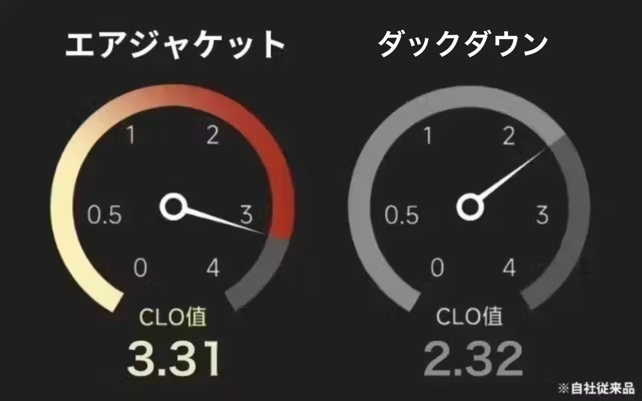 自社従来品のダックダウンに比べてエアジャケットのCLo値は3.31と格段にアップしております!暖かいジャケットは、人体から発熱する体温をいかに外気に放出しないかで、暖かさの性能が決まります。それを表す数値がCLo値です。
