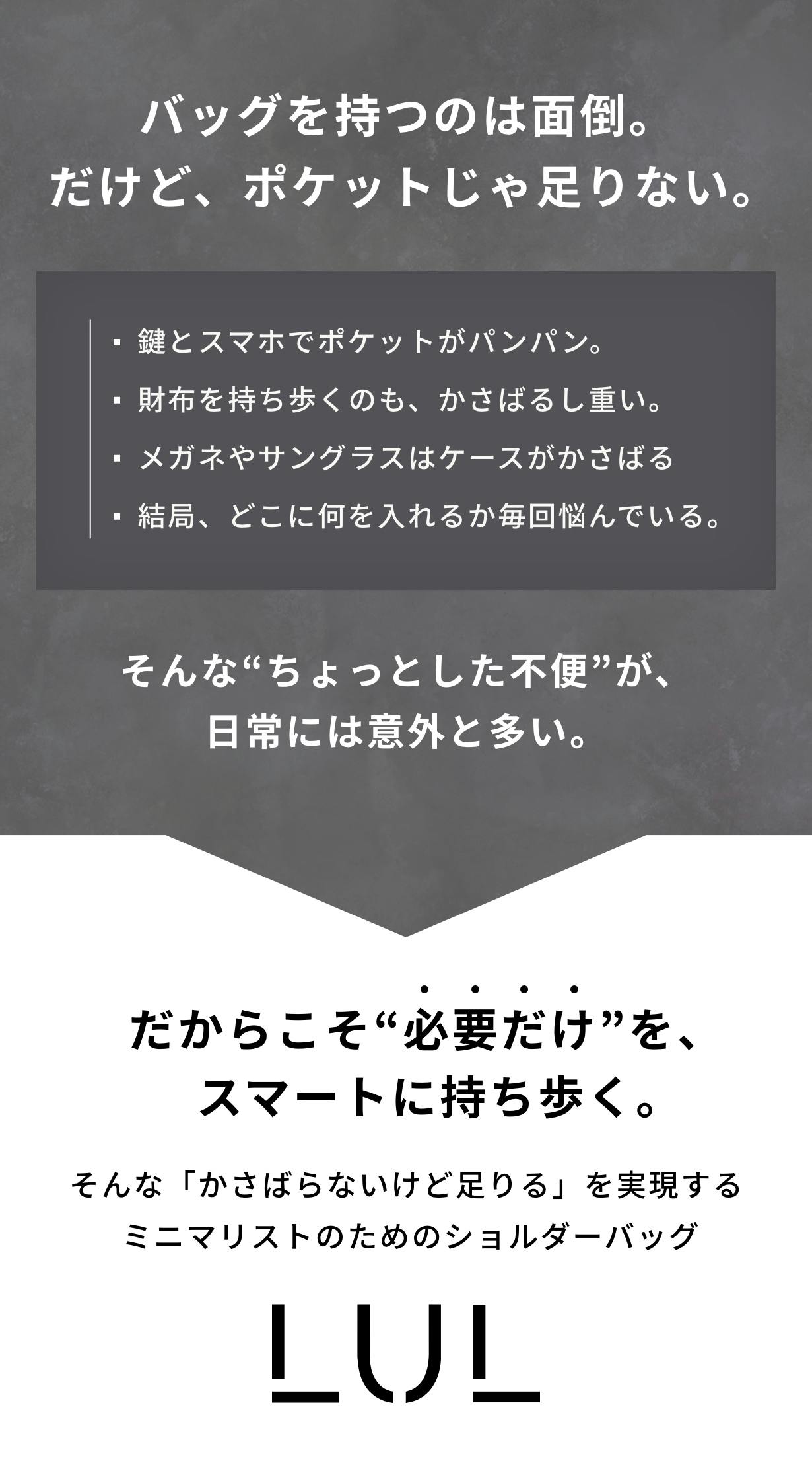 鍵、スマホ、カードだけで出かけたい日。でもポケットはパンパンになるし、バッグを持つほどでもない。LULはそんな“ちょうどいい日常”のために設計されました。