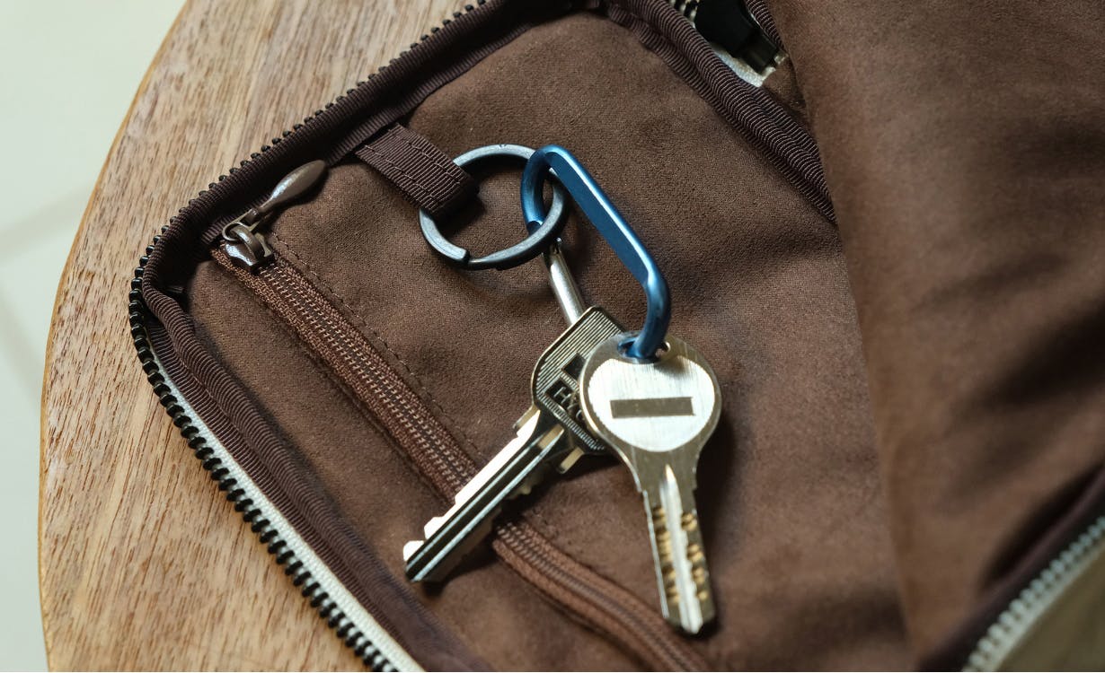 鍵や紛失タグ(AirTagなど)をしっかり固定できるDカン付き。バッグの中でガチャガチャせず、すぐに取り出せる安心感。