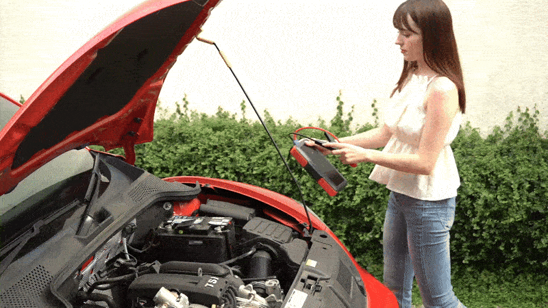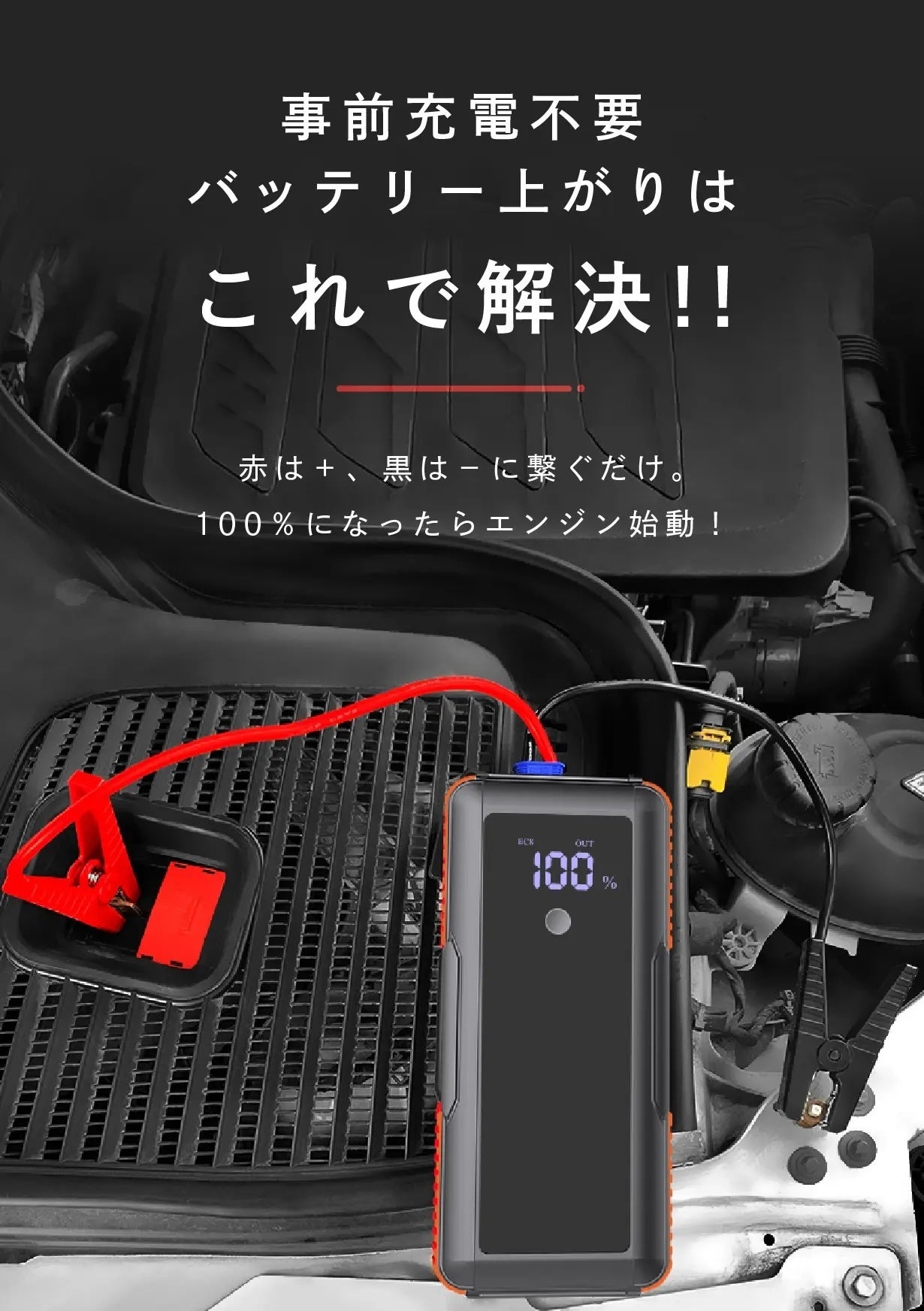 ①ボンネットをあげて②+と−の電極につなぐだけ!