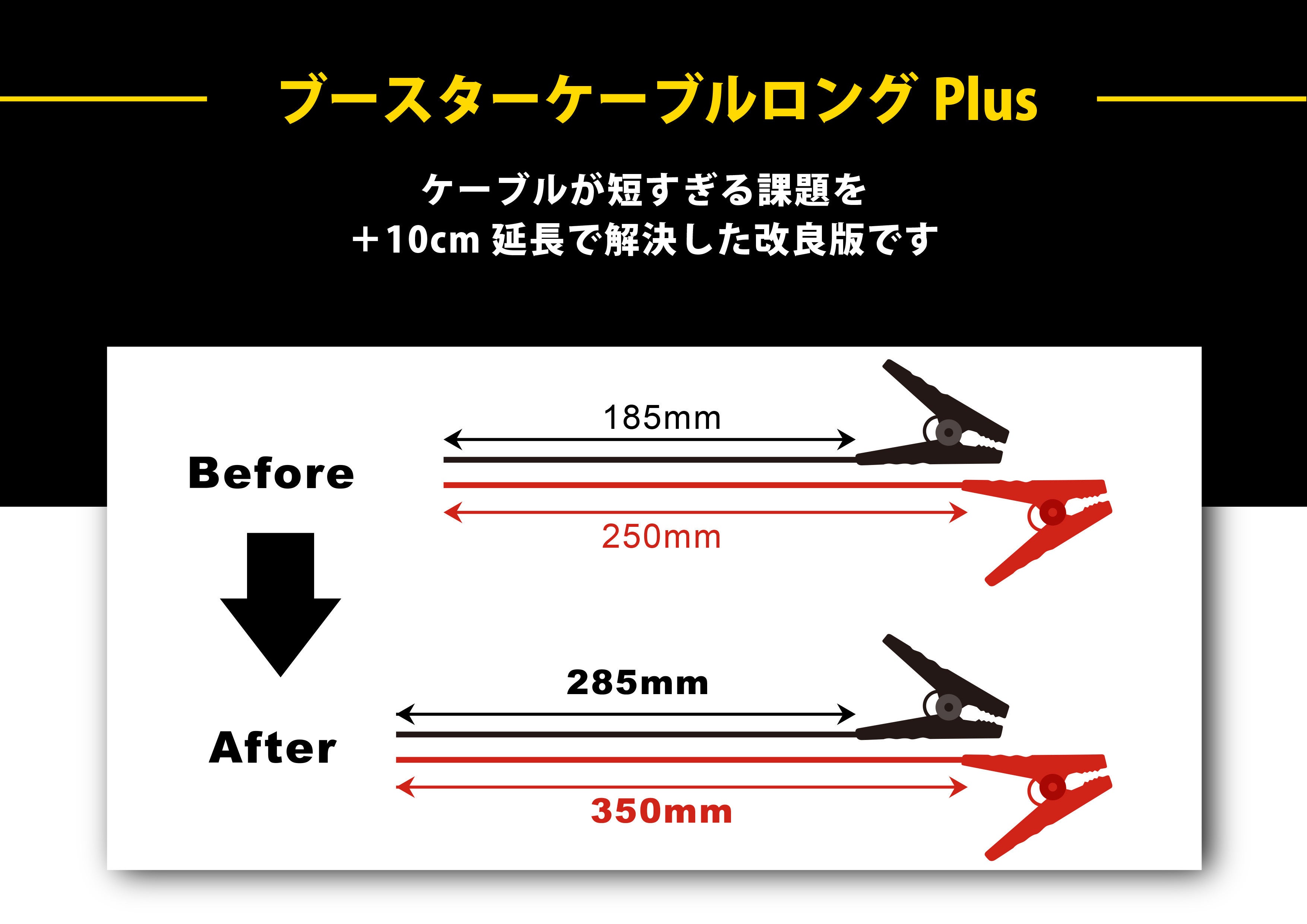そこで両方のケーブルを+10cm延長し、より便利に扱える(ブースターケーブルロングPlus)に改良しました。