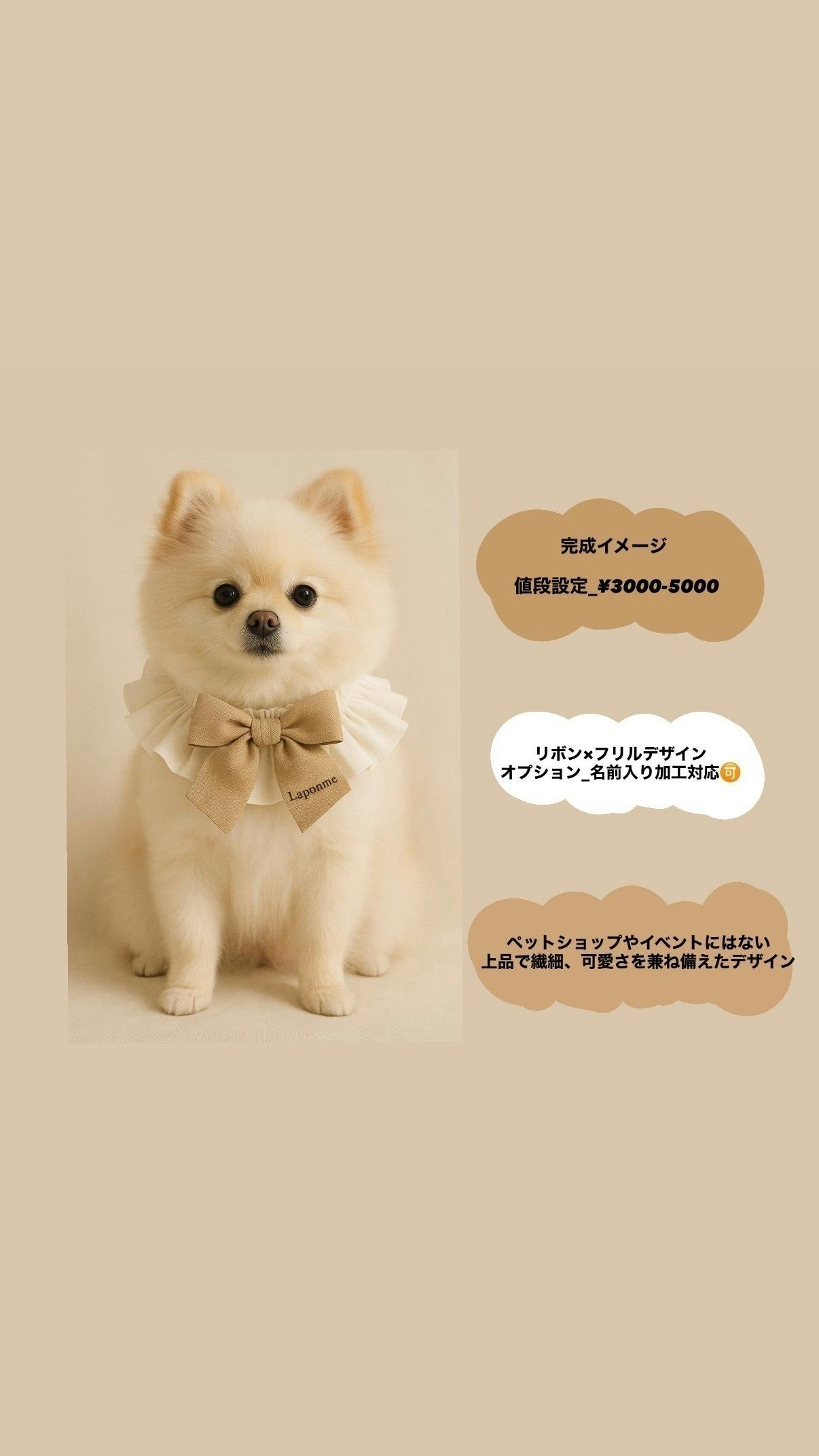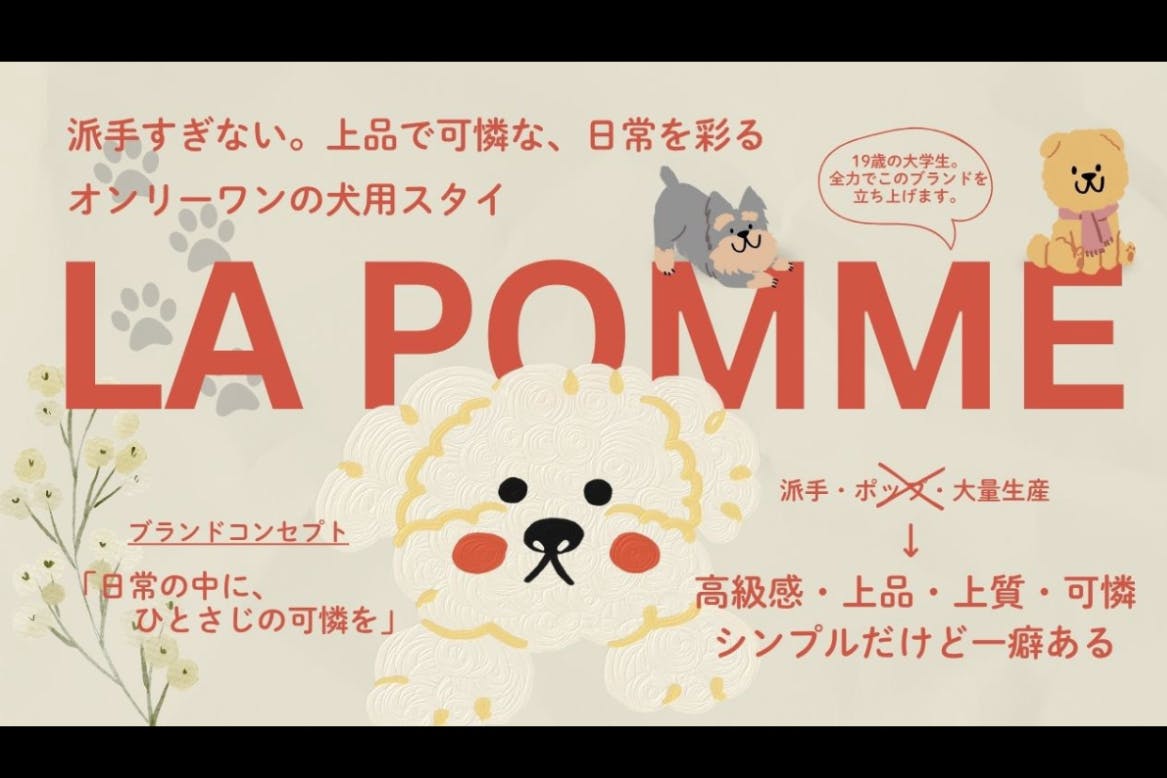 私は、2026年に犬用スタイの新しいブランド「La pomme」を立ち上げることを目指しています。このプロジェクトを通して、日常生活の中で犬たちがより快適に、そして飼い主の皆様がよりスタイリッシュに愛犬と過ごせるようなアイテムを提供したいと考えています。「La pomme」は、“日常の中に、ひとさじの可憐を。”というブランド哲学のもと、シンプルでありながらも人々の目を引くデザインを追求します。