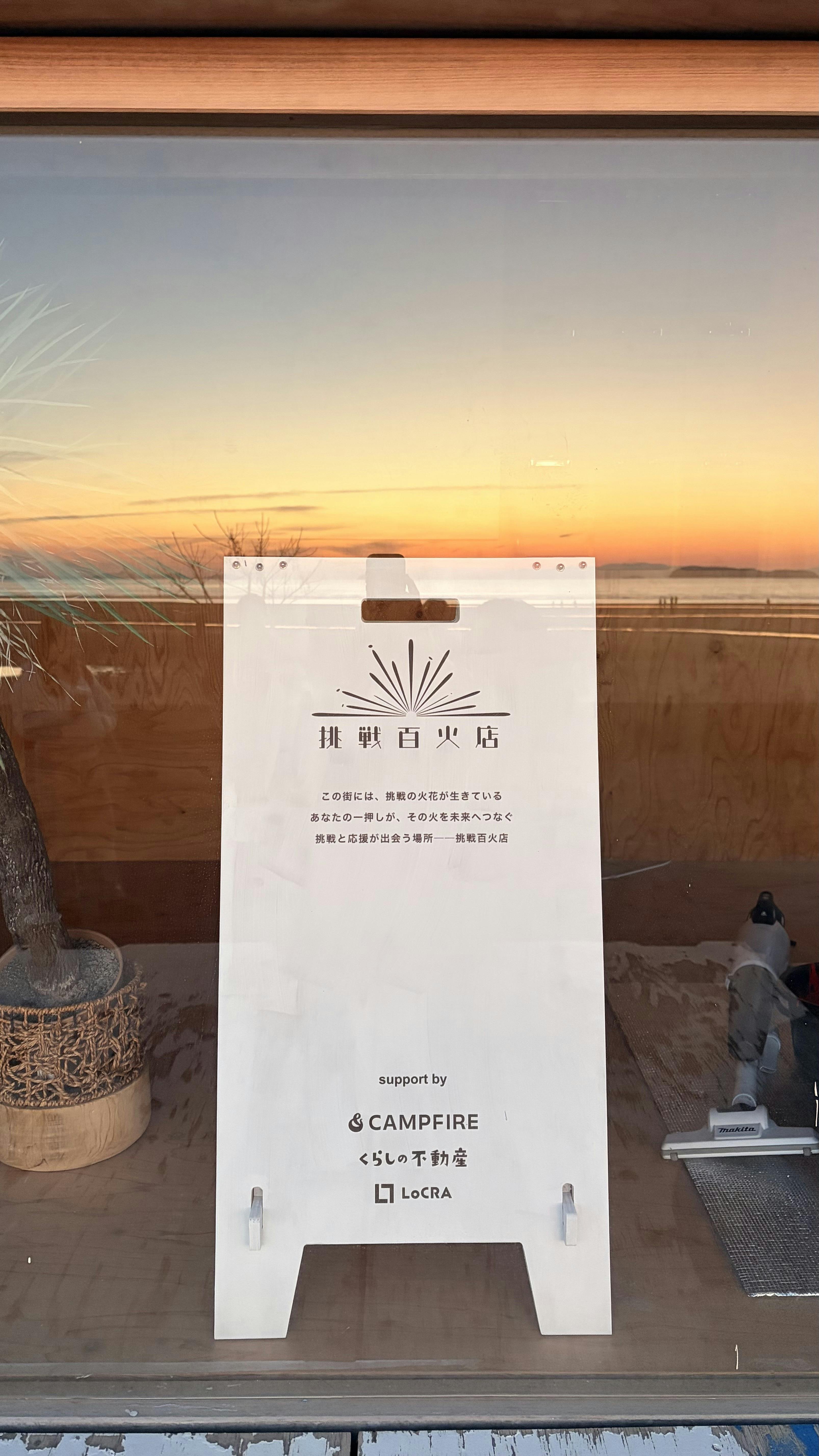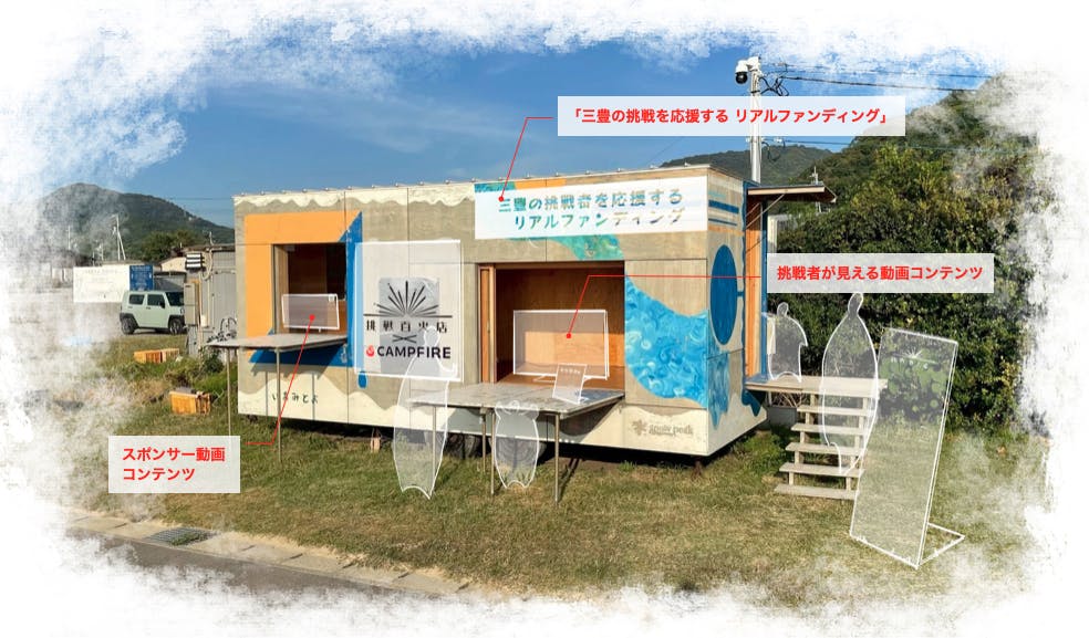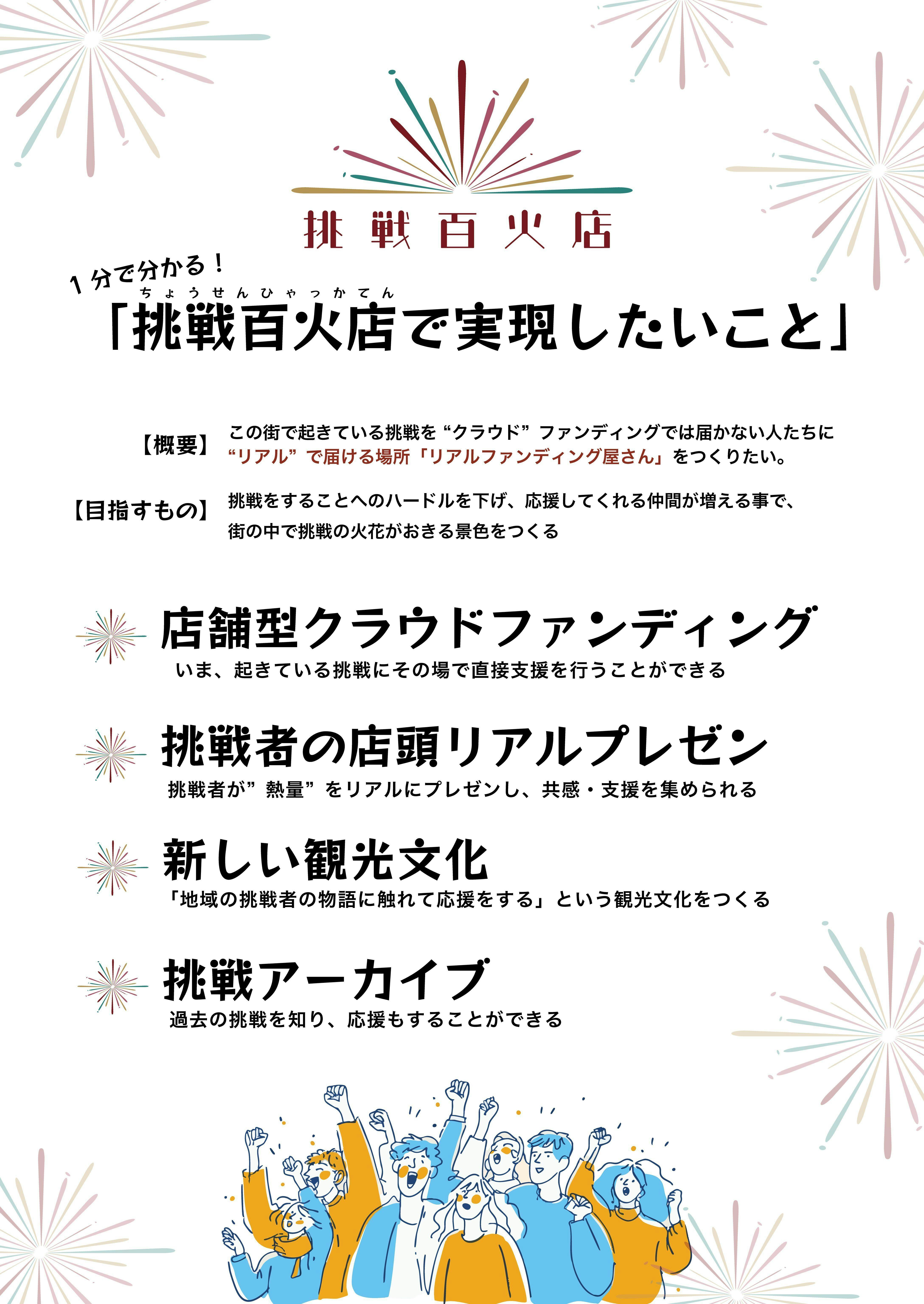 『挑戦百火店』では、クラウドファンディングのリアル版として、地域の挑戦者を応援する常設の場所を作ります。