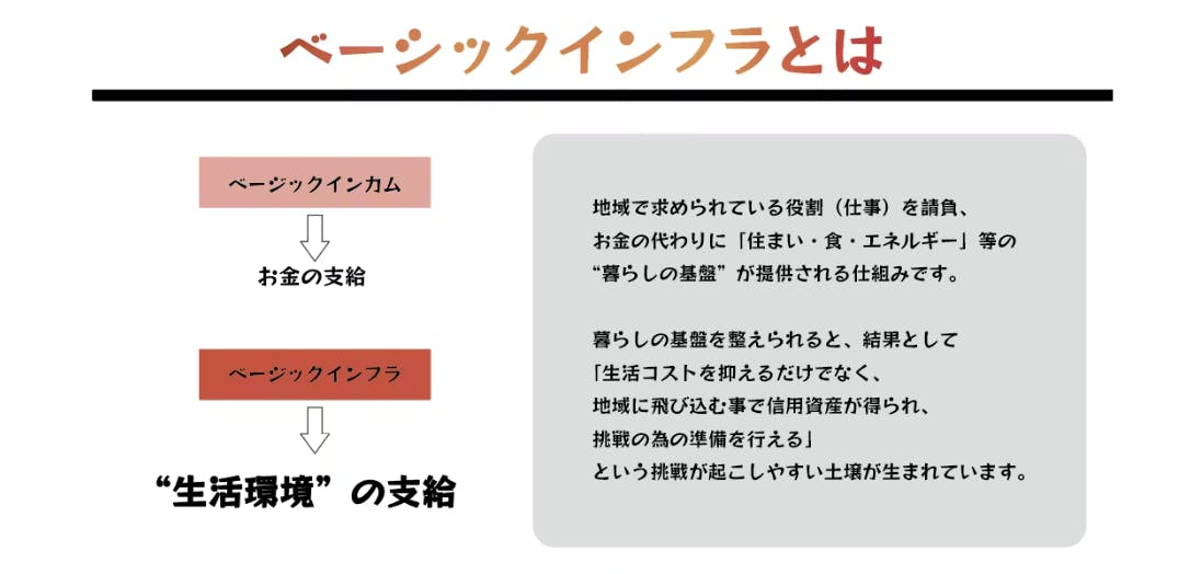 海外で実施されている"ベーシックインカム"が「お金の支給」による自由を目指すのに対し、"ベーシックインフラ"は「住環境」を提供することで、地域に飛び込みやすい入口をつくっています。(ベーシックインフラHP)