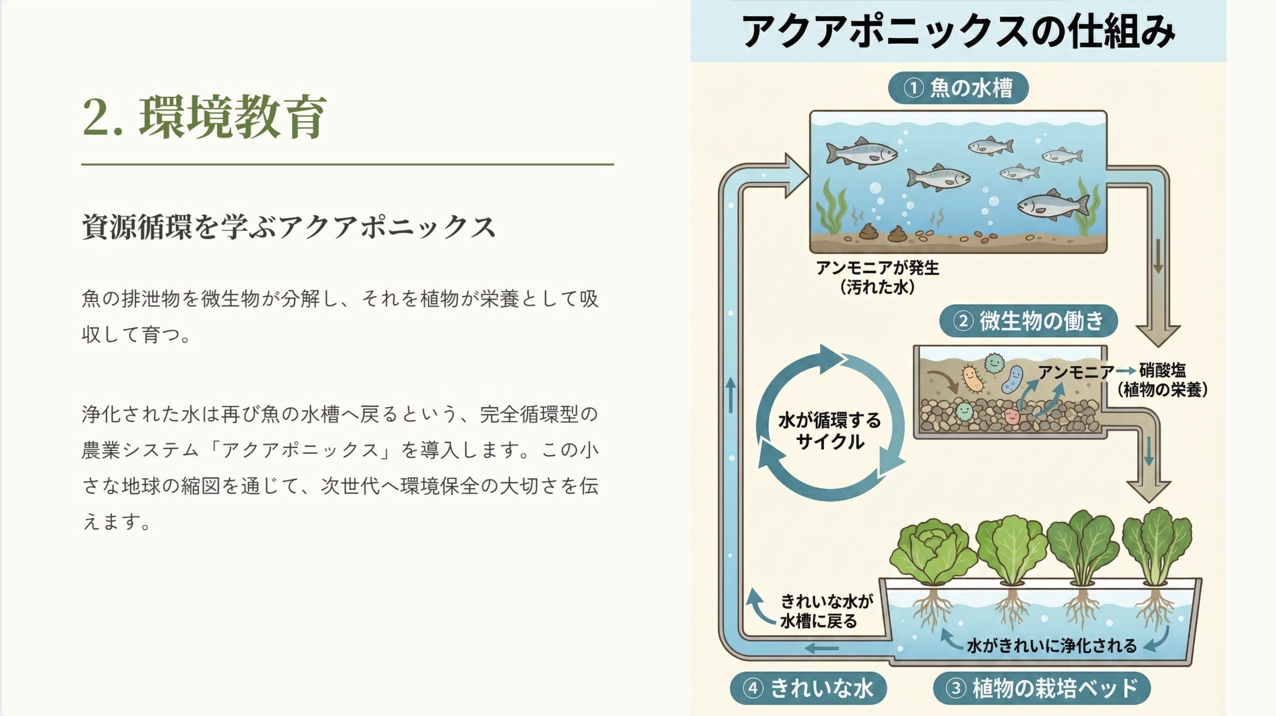 魚たちの命(排泄物)が栄養となり、野菜を育て、野菜が水を浄化して再び魚を元気にする。