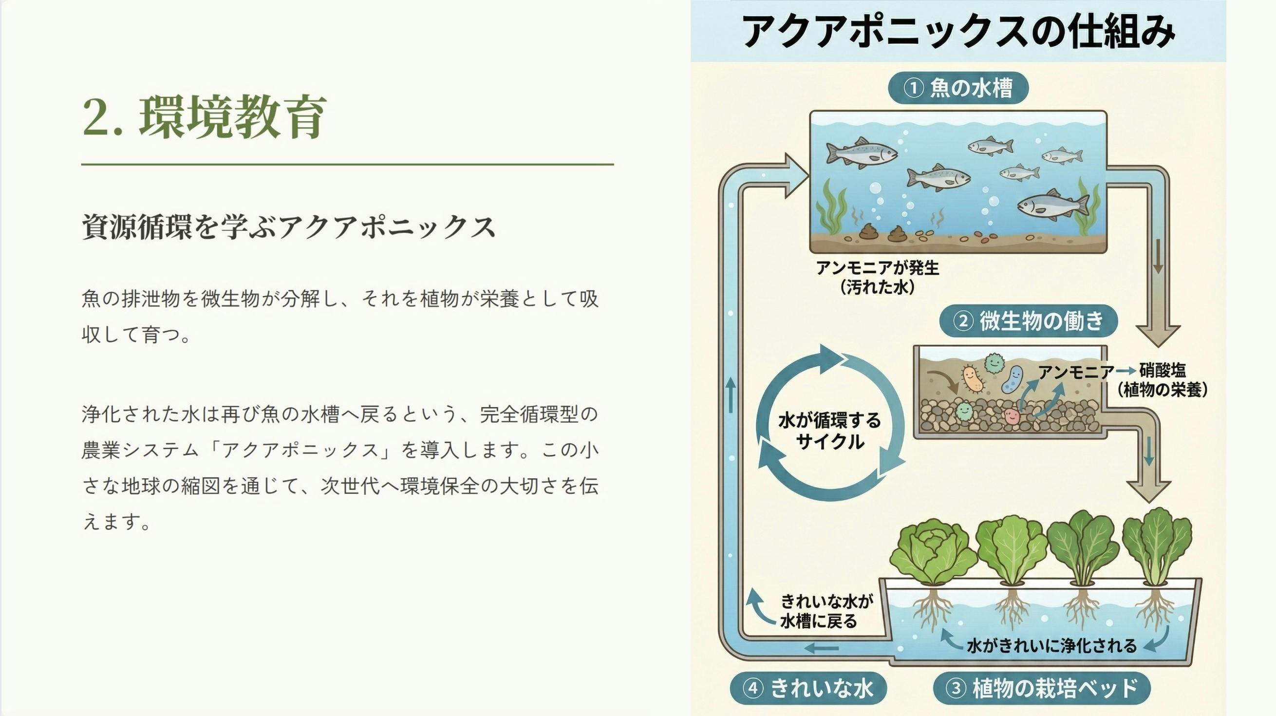 この“小さな地球”とも呼べる循環システムを“見える化”し 、子供から大人まで、誰もが「食=命の循環」を五感で学べる空間を創ります。