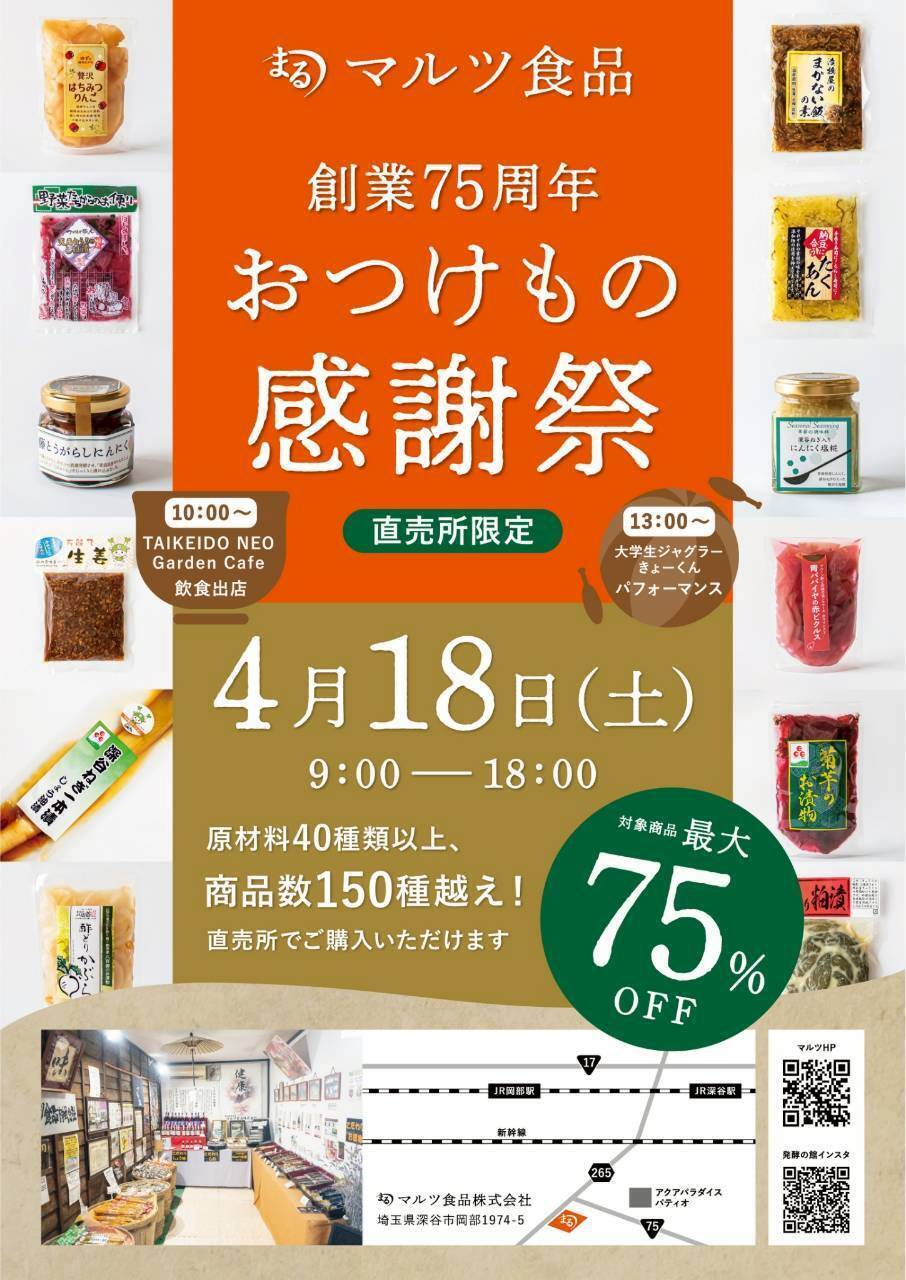 2026/04/12 19:45 創業75周年記念おつけもの感謝祭 開催\ 最大75%OFFの大感謝企画!! /マルツ食品が本気でお届けするおつけもの好きにはたまらない1日!!━━━━━━━━━━━━━━━日程:4月18日(土)時間:9:00〜18:00会場:マルツ食品 直売所(埼玉県深谷市岡部1974-5)━━━━━━━━━━━━━━━・ 原材料40種類以上!・商品数150種類越え!・ここでしか買えない限定商品も多数!さらに…おつけもの 最大75%OFFこれはもう来るしかないレベルです!!さらに!人気の深谷の飲食出店あり(10:00〜)TAIKEIDO NEO Garden Cafe 出店@taikeidoneogardencafe13:00〜深谷市出身の大学生ジャグラー「きょーくん」@kyookun_jugglerパフォーマンス開催ご家族でのお出かけにも◎お土産・まとめ買いにも◎発酵の魅力を体感できる1日です!ぜひ遊びに来てください。━━━━━━━━━━━━━━━埼玉県深谷市岡部1974-5(駐車場あり)━━━━━━━━━━━━━━━ もっと見る