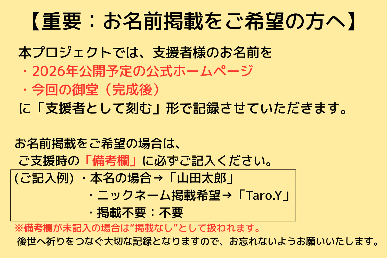 お名前掲載をご希望の場合は、ご支援時の「備考欄」に必ずご記入ください。