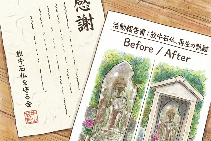 2026/01/02 10:54このたび、放牛石仏御堂建立プロジェクトは、426,000円 のご支援をお寄せいただき、無事に期間を終えることができました。ご支援くださった皆さま、応援の言葉を寄せてくださった皆さまに、心より御礼申し上げます。本プロジェクトは、派手な告知や大きな広がりを目指したものではありませんでした。それでも、多くの方がこの取り組みに心を寄せ、静かに、確かに支えてくださいました。放牛石仏は、300年にわたり、地域の中で守られてきた存在です。今回のご支援は、その祈りが今も人の心に届いている証であり、次の世代へとつなぐための大切な一歩だと受け止めています。お寄せいただいたご支援は、石仏を雨風から守るための御堂設置をはじめ、今後の保全活動に大切に活用させていただきます。今回の取り組みを通して、あらためて感じたのは、「守る」という行為は、一度きりで終わるものではないということです。これからも、放牛石仏を守る会として、一つひとつの活動を丁寧に積み重ねてまいります。今後の活動についても、折に触れてご報告させていただければ幸いです。あらためまして、このたびのご支援、誠にありがとうございました。放牛石仏を守る会 もっと見る