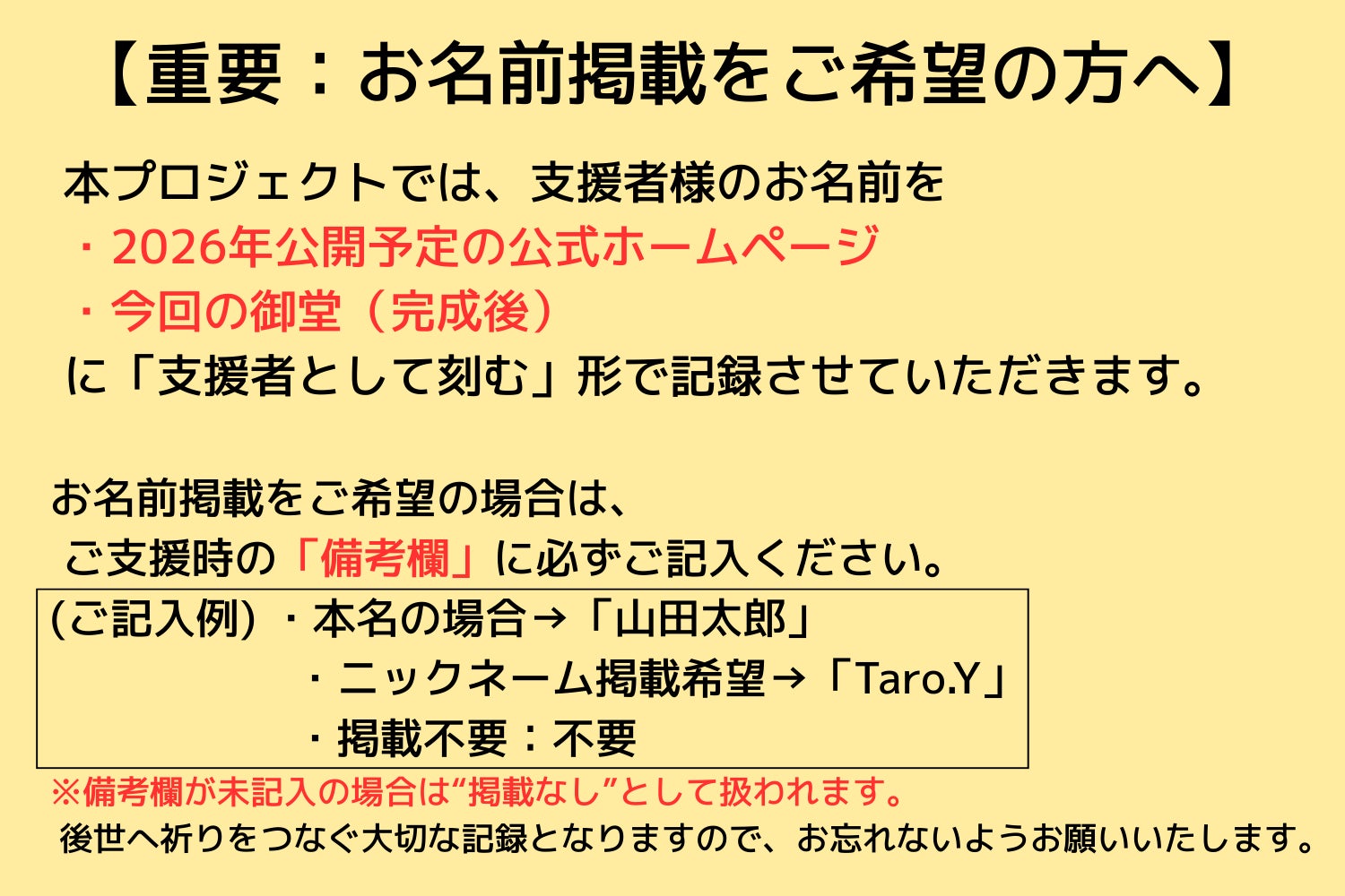 「お名前」と「支援額」を掲載(記銘)させていただきます。