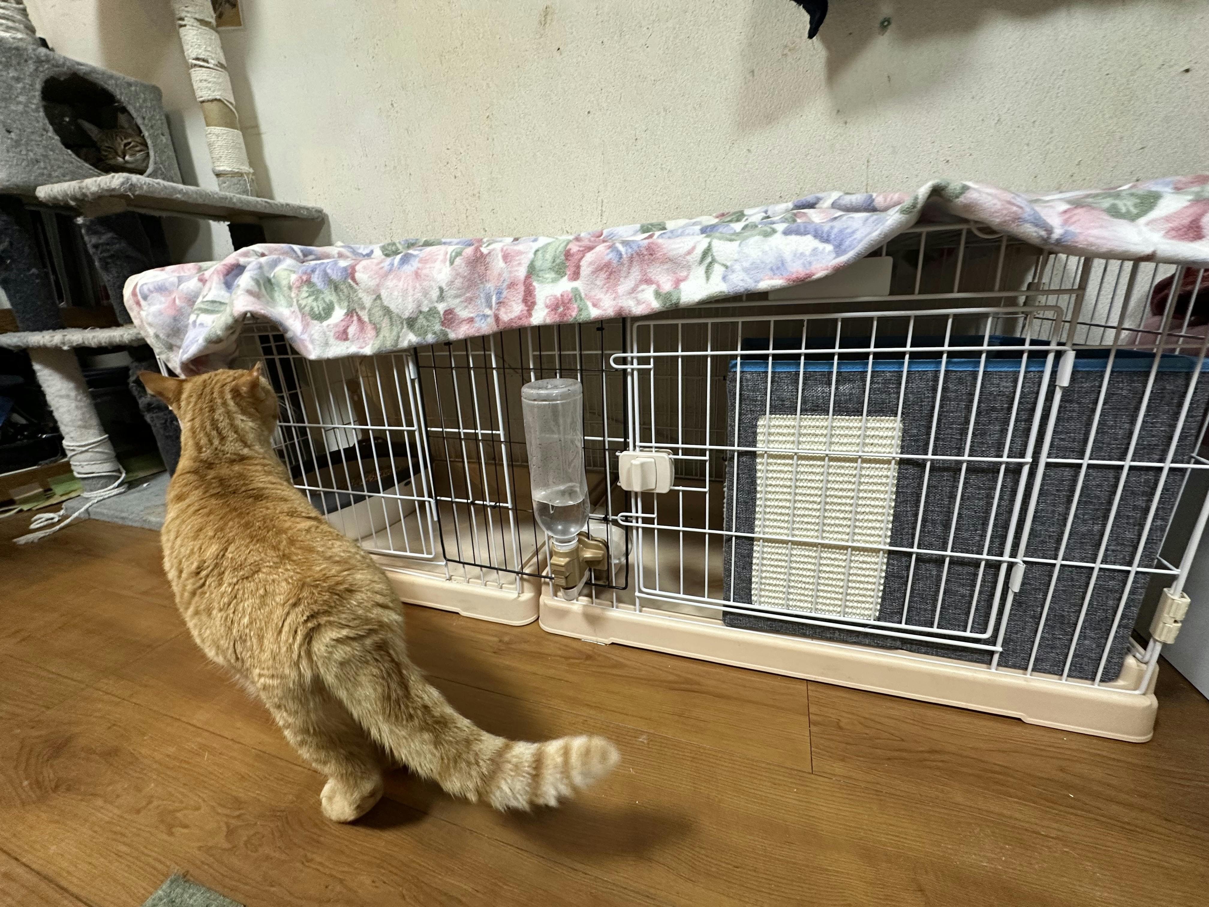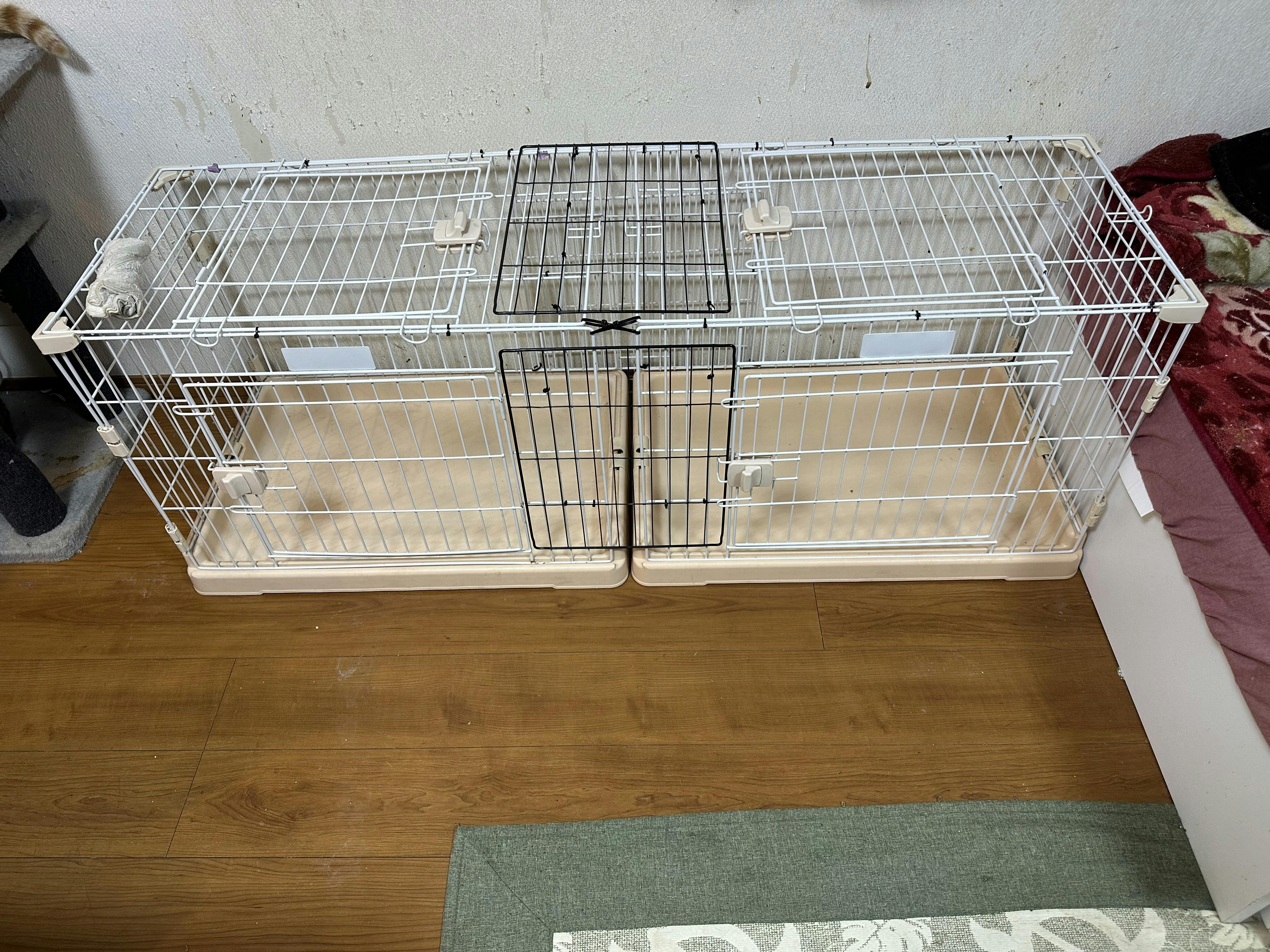 皮下点滴やお薬注射などしてもらって帰ってきてから、シングルケージを2つ繋いでけんじのケージを作りました。