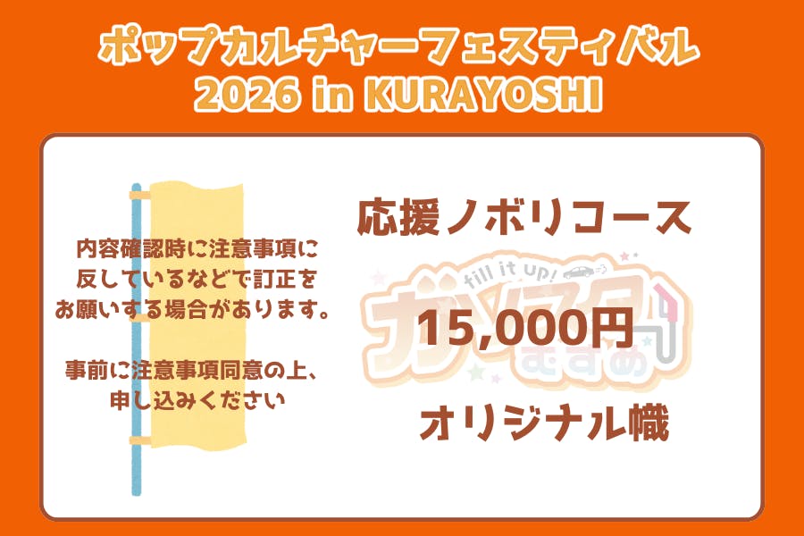 2025/12/22 12:00皆さんの熱いお声にポプフェス運営さんも応えてくださるようです!ご協力いただいたアンケートの結果と要望の内容をお伝えしたところ、ファンの皆さんがお好きにデザインが出来るノボリ作成コースをご用意することになりました!また、事業者様、キャラクター運営をされている方のPRにも是非ご利用くださいとの事です。*イベントに参加されているキャラクターに関しては、権利を持っている方の許可があれば、該当キャラクターのイラストを使用することが可能です。詳しくは説明ページをご覧ください。会場を彩るノボリでアナタの推しをPRしてください♪ もっと見る
