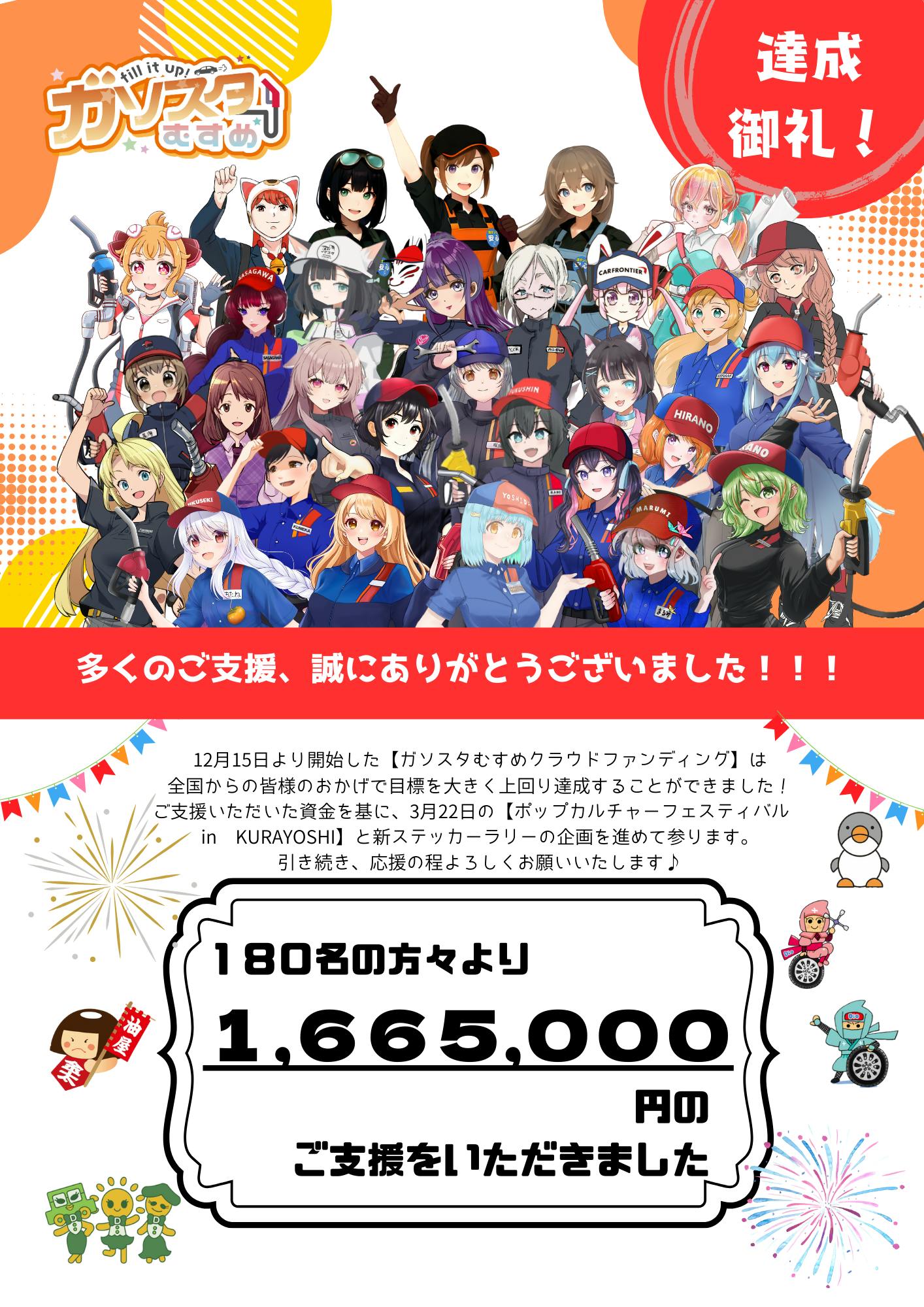 このたび、皆さんと一緒に【ポップカルチャーフェスティバル2026 in KURAYOSHI】を開催し、さらに範囲を広げた全国規模の【ガソスタむすめステッカーラリー】を実現したいと思い、クラウドファンディングに挑戦させていただきます。