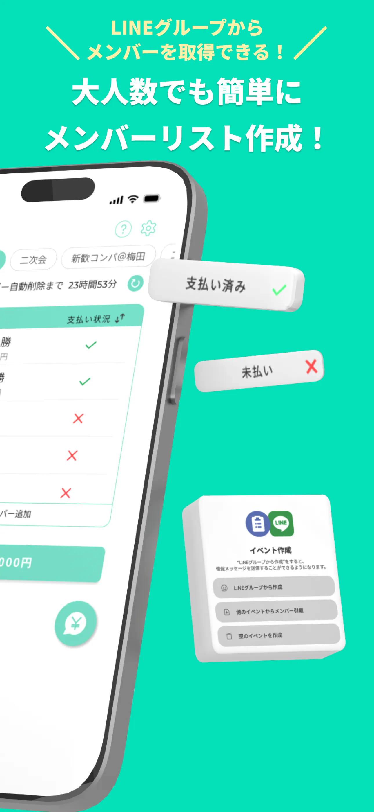 集金くんは、LINEと連携することで、集金するメンバーのリストを自動作成できる、世界初のスマホアプリです。