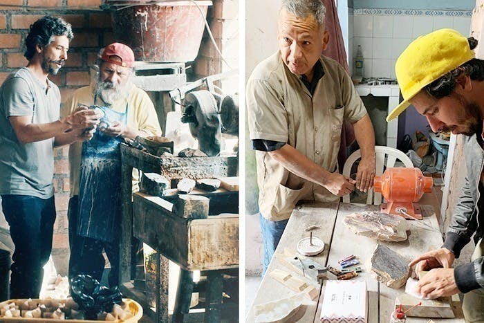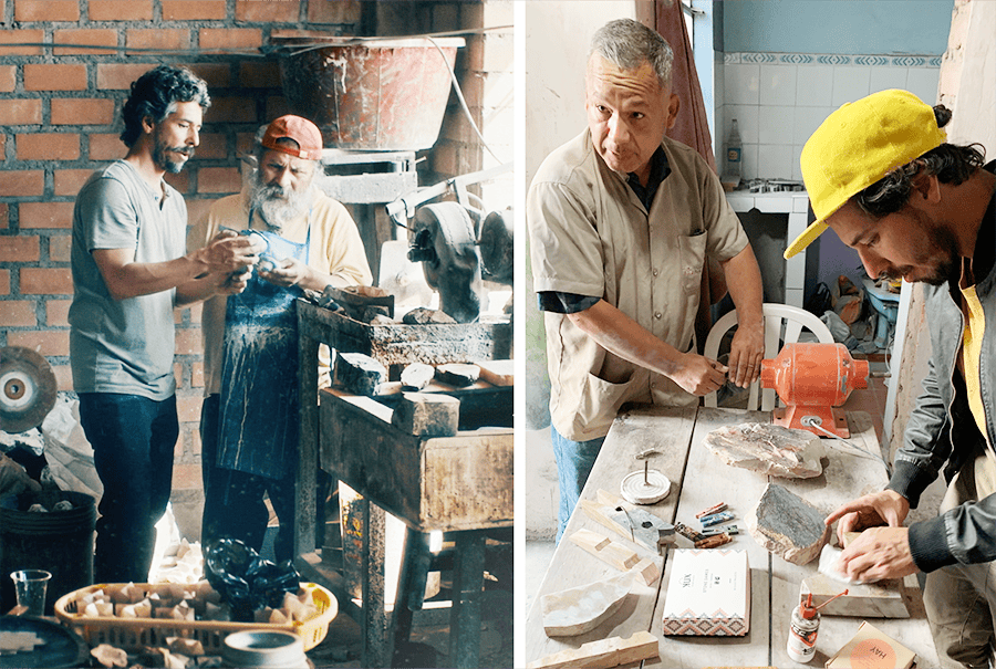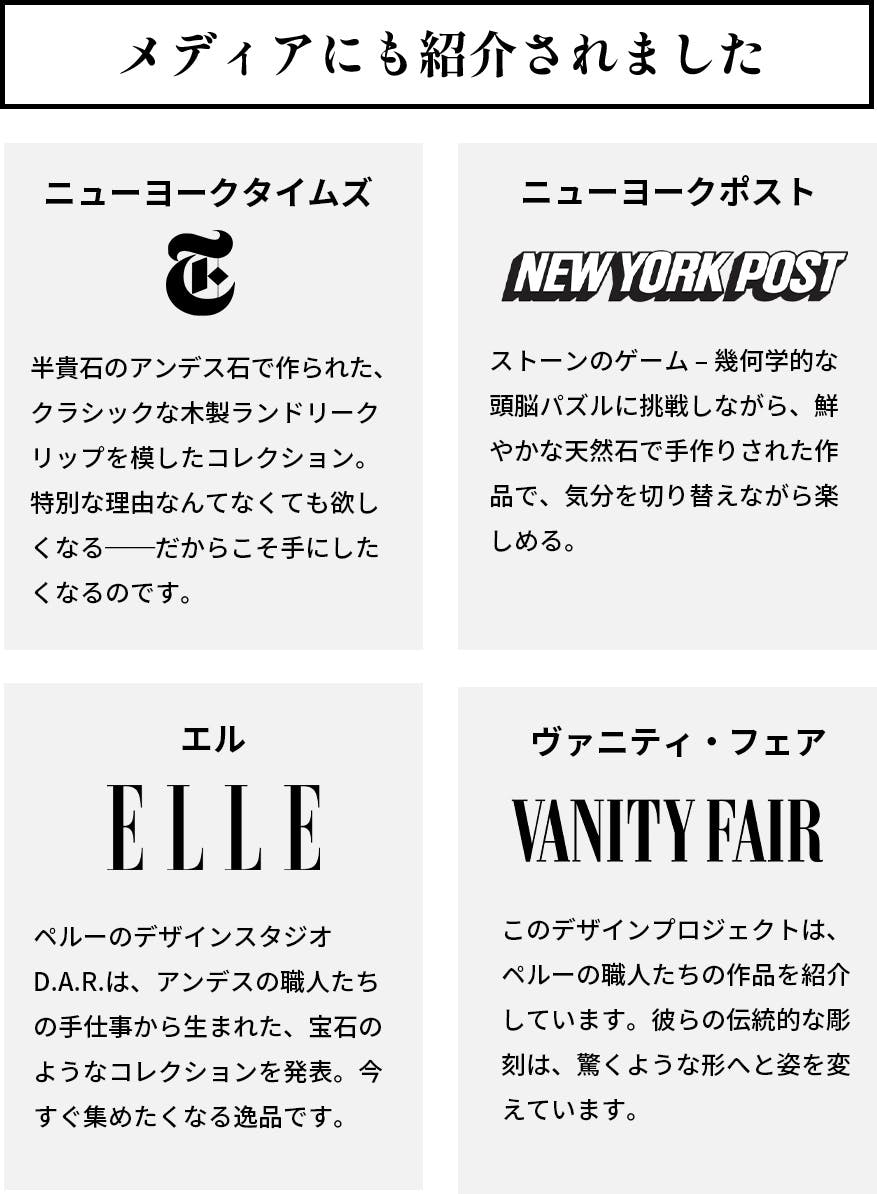 A. はい。ペルー北部の職人たちが、すべてのパーツを手作業で削り出しています。伝統的な技術と現代的なデザインの融合によって生まれた製品です。