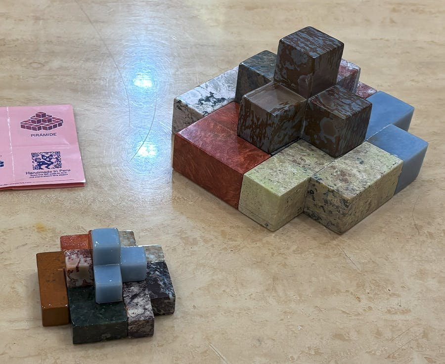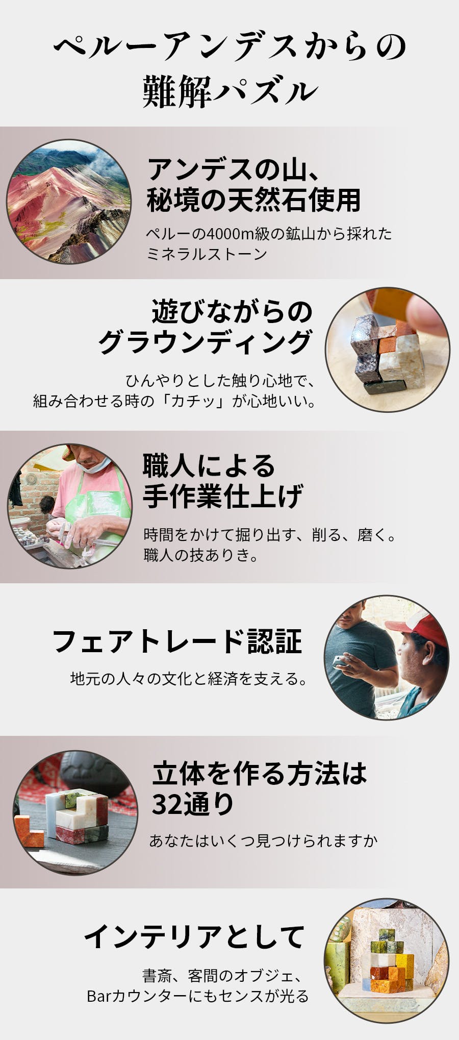 この立体パズルに使われているのは、ペルーの4000m級の鉱山から採れたミネラルストーンであり、パワーストーン。