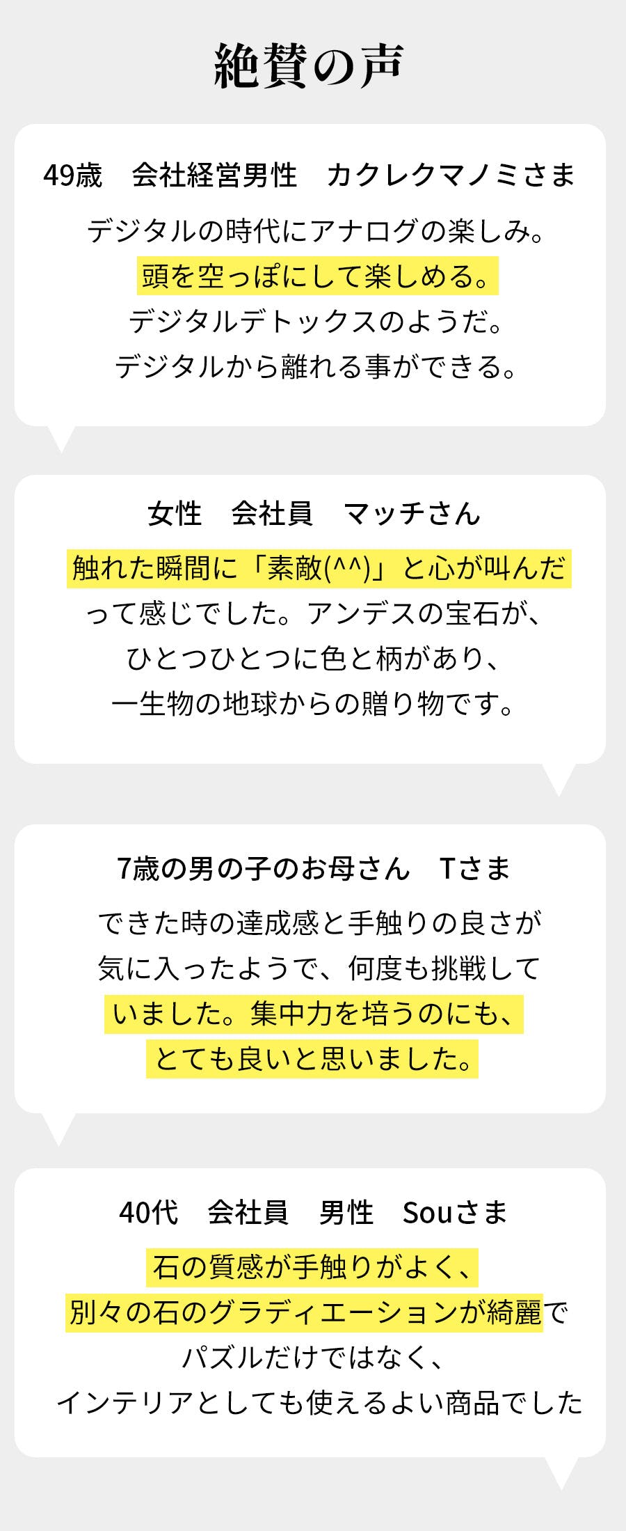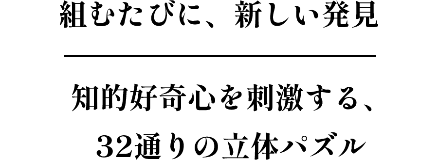 「やったー!」という達成感。崩してまた同じ形を作ろうとすると、できない。そんな「もどかしさ」と「没頭感」。"大人も、子供も毎回が初チャレンジ"そんな感覚がこのパズルの魅力です。