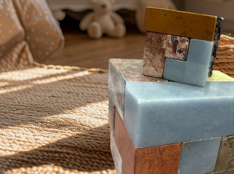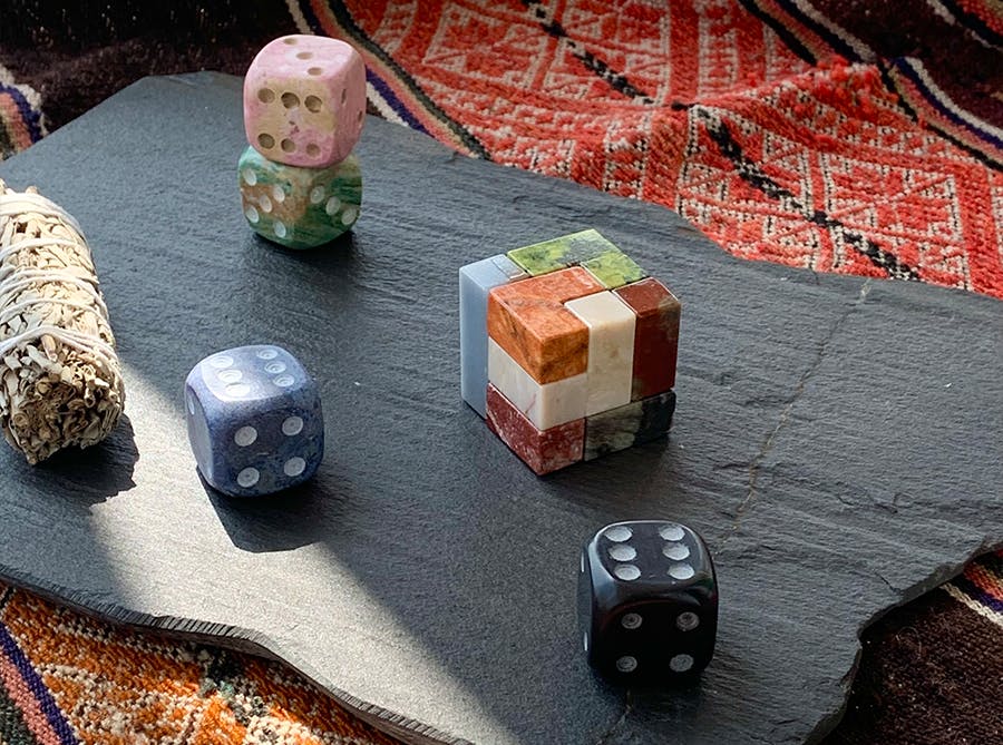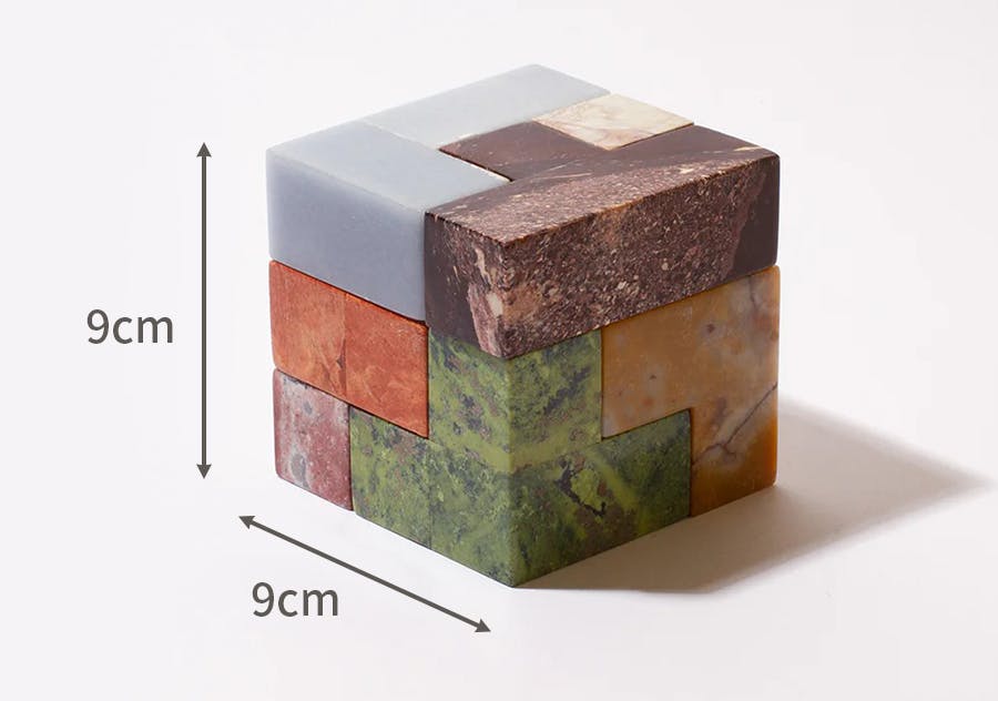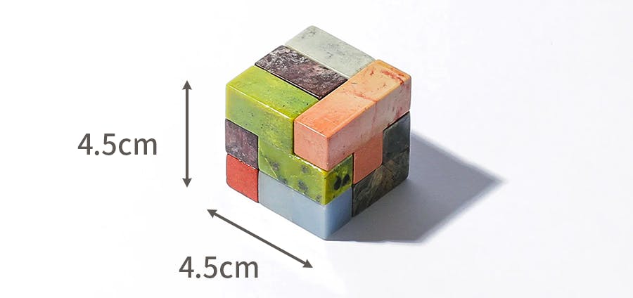 A.小さな約4.5cm角の立方体と、大きな約9cm角のXLサイズの立方体の2種類をご用意しています。どちらも天然石の質感を手のひらで感じられる、存在感のあるサイズです。