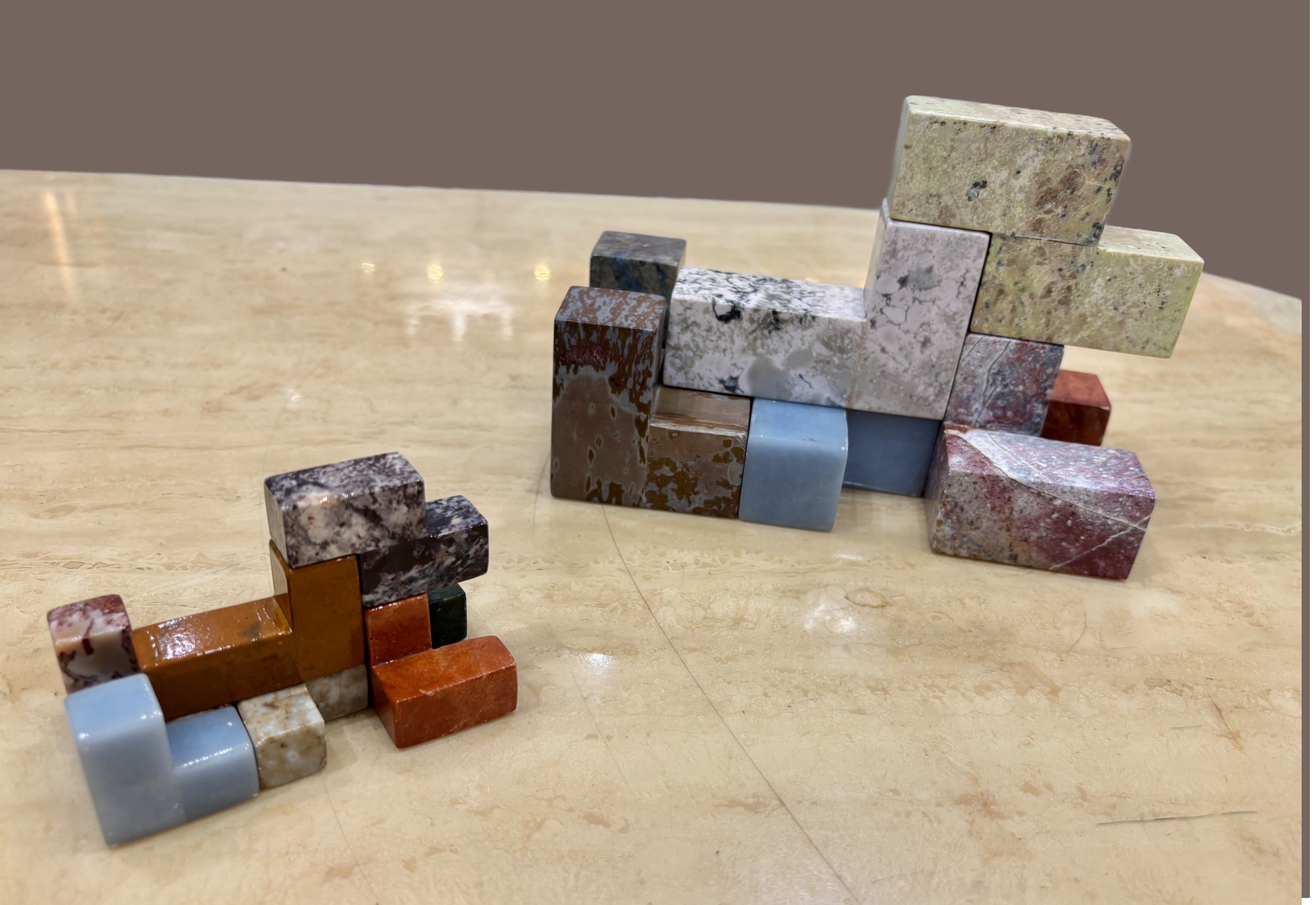 この天然石は 石のテーブルに飾るとこのような高級感。ヨーロッパの教会の壁面、を思う重厚感です。すべて同じに出来上がる工業製品とはちがいます。リアル地球石ですから、ずーっと子、孫の世代に渡し、つなぐに価値ある天然石。おしゃれな雰囲気を出します。玄関に犬を組みましょうか。 犬も形成はなかなか難解です。チャレンジてください一番難しいのはどれでしょう。 ピラミッド型?あれ?あれ?大人がはまります。Instagram @gemstone1218go ではピラミッド挑戦中の親子のパスㇽの取り合いっこがほほえましく取り上げられています。「だって、パパが貸してくれないんだもーーん」「まてまて! パパすぐできるから!!」ママの笑い声。。心の癒しにグランディング。といいますが、この時代にアナログの楽しさを味わっていただきたいと思っています。毎回はまっても罪悪感なしです。(^^読んでいただいて、ありがとうございます。夏には星形パズルをご紹介します。それも楽しみにしていただきたいです。