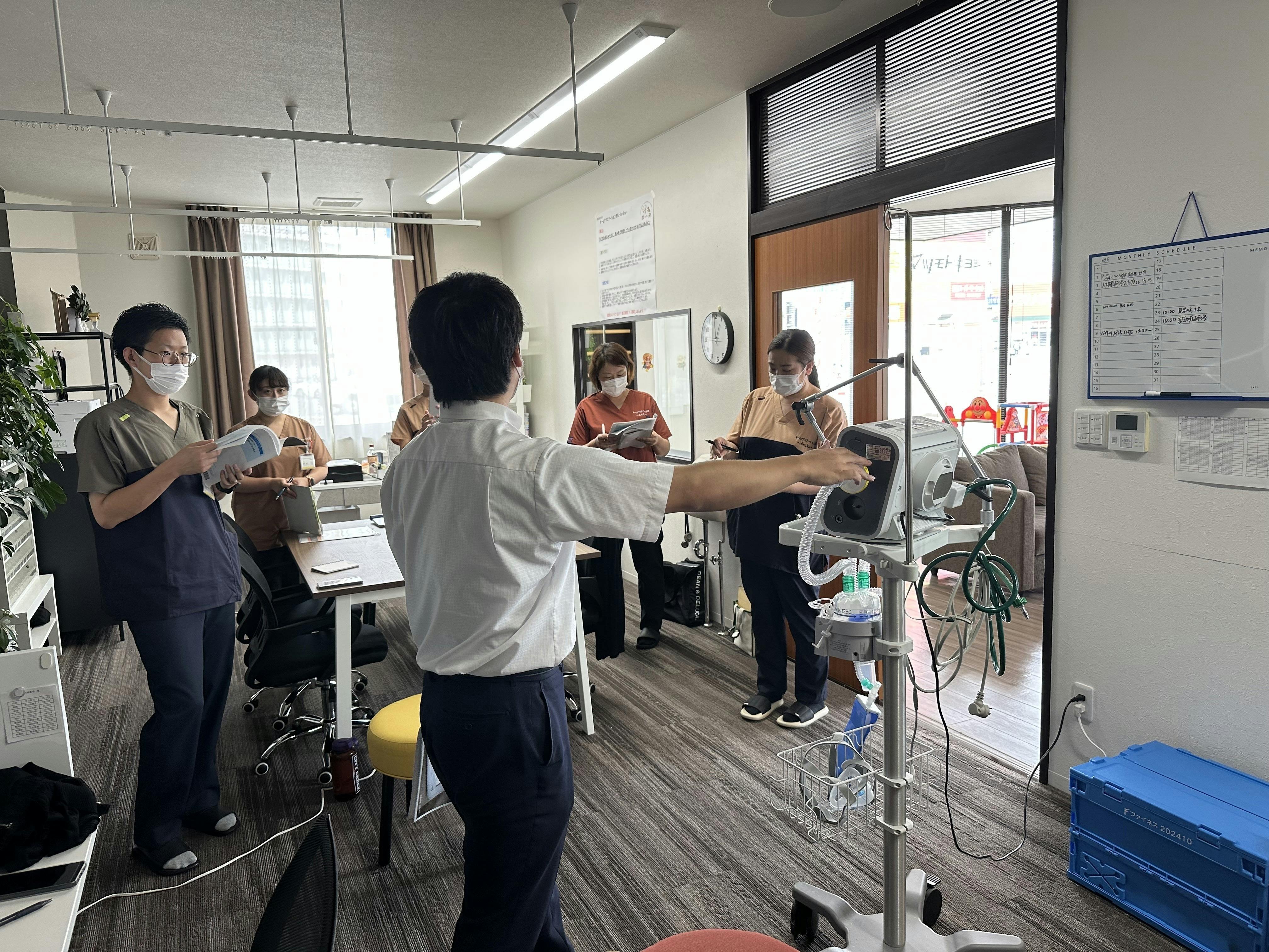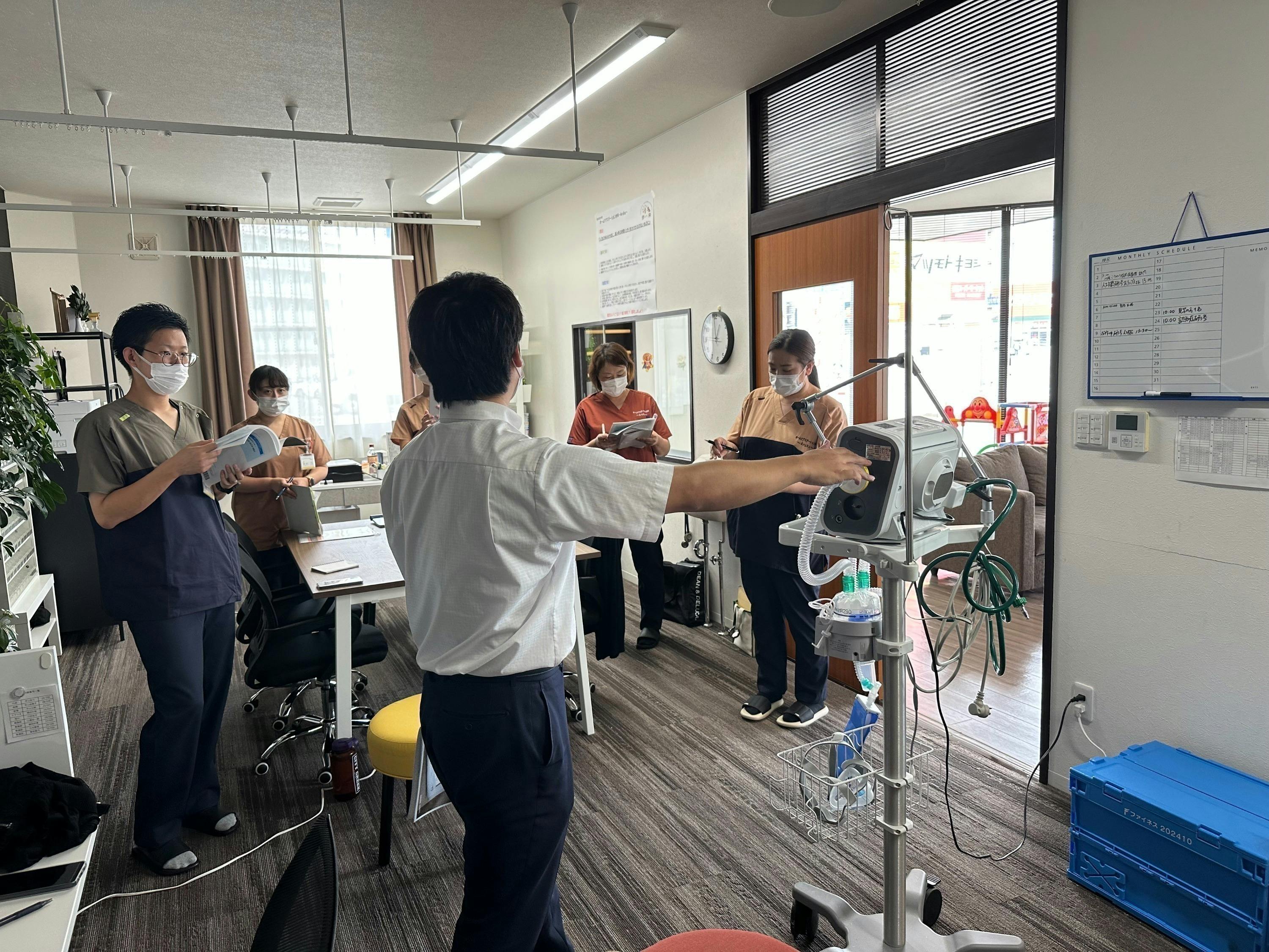 どんな小さなことでも気軽に声をかけてもらえる、そんな“あたたかいつながりのある能登”をつくっていきたいと思っています。どのような課題をも克服するため、時には専門講師による研修を企画し、全員で学習したり、スタッフによる専門分野において講師となりお互いのスキルアップにつなげています。 人工呼吸器について(研修より)
