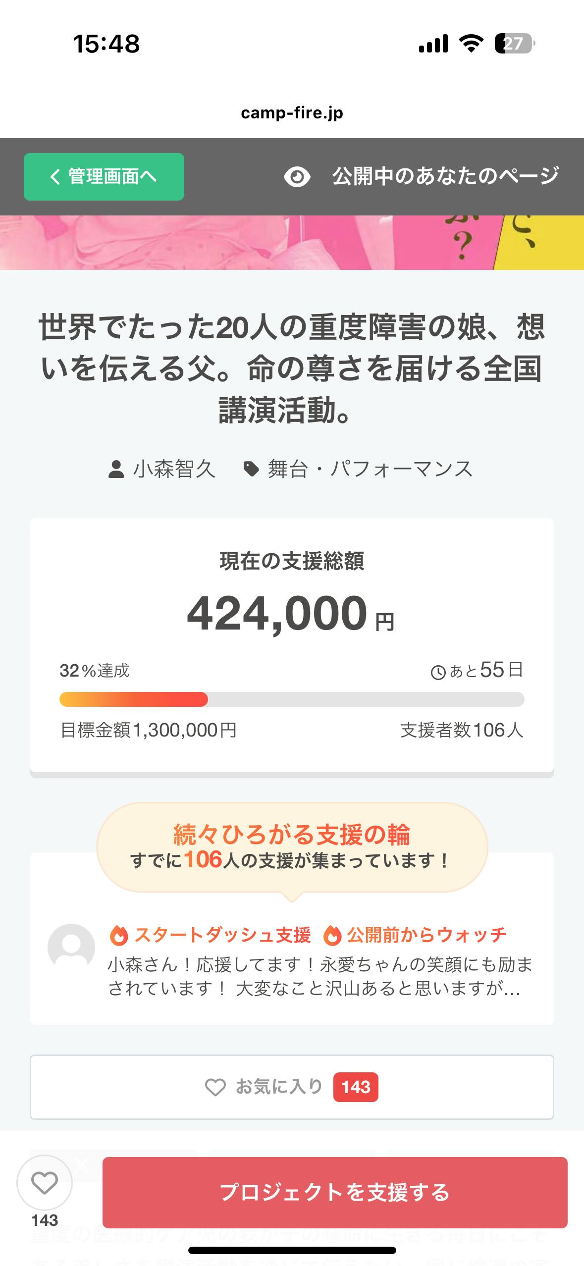 現在106名の方にご支援いただきました。