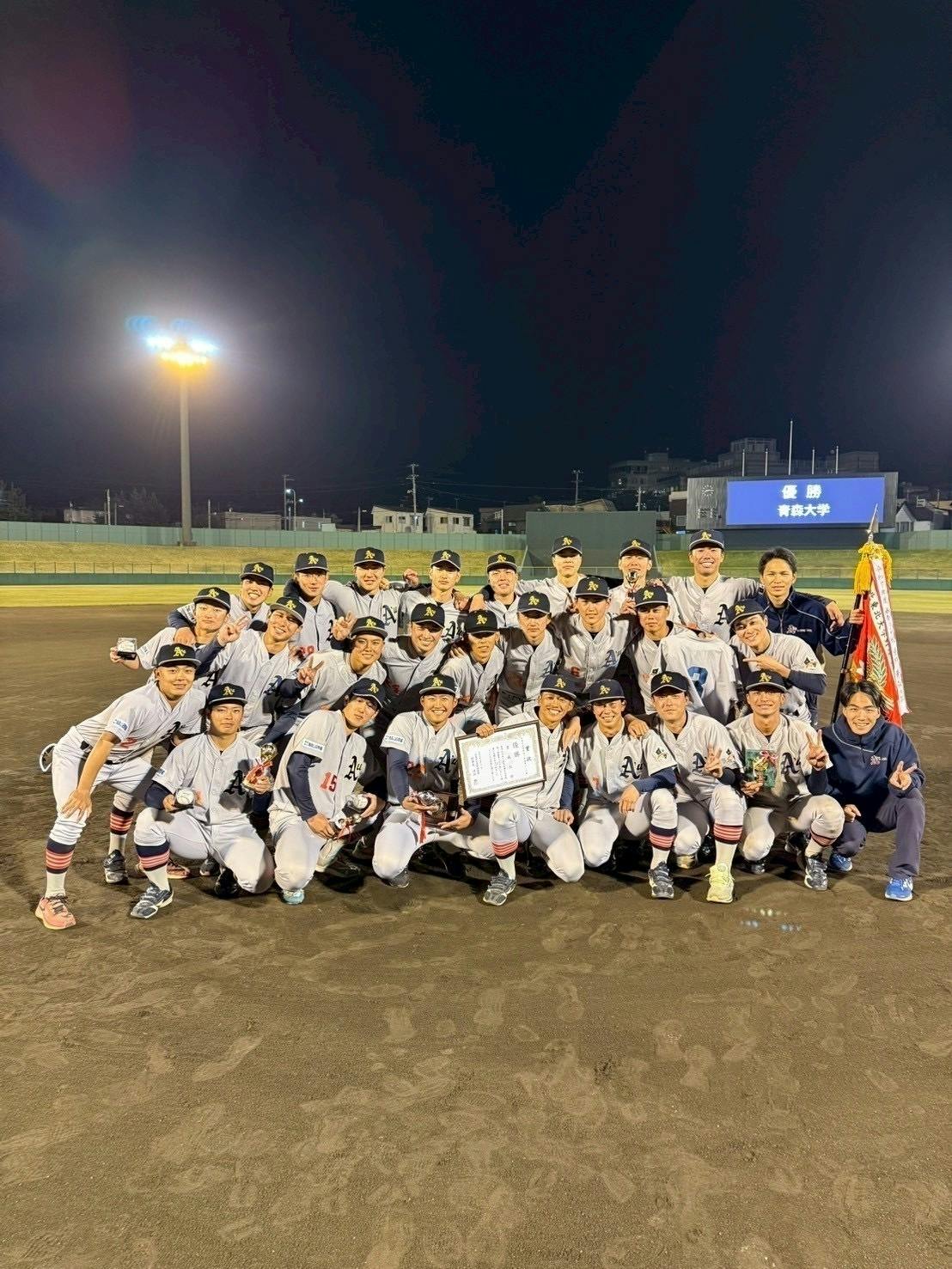 青森大学硬式野球部は、総勢119名(部員116名、マネージャー3名)で活動しています。北東北大学野球連盟1部リーグに所属しており、今年度の春季リーグ戦では17年ぶりに優勝を掴み取ることが出来ました!!ですが8月に行われた秋季リーグ戦や10月に行われたトーナメント大会では、惜しくも優勝を逃しました。