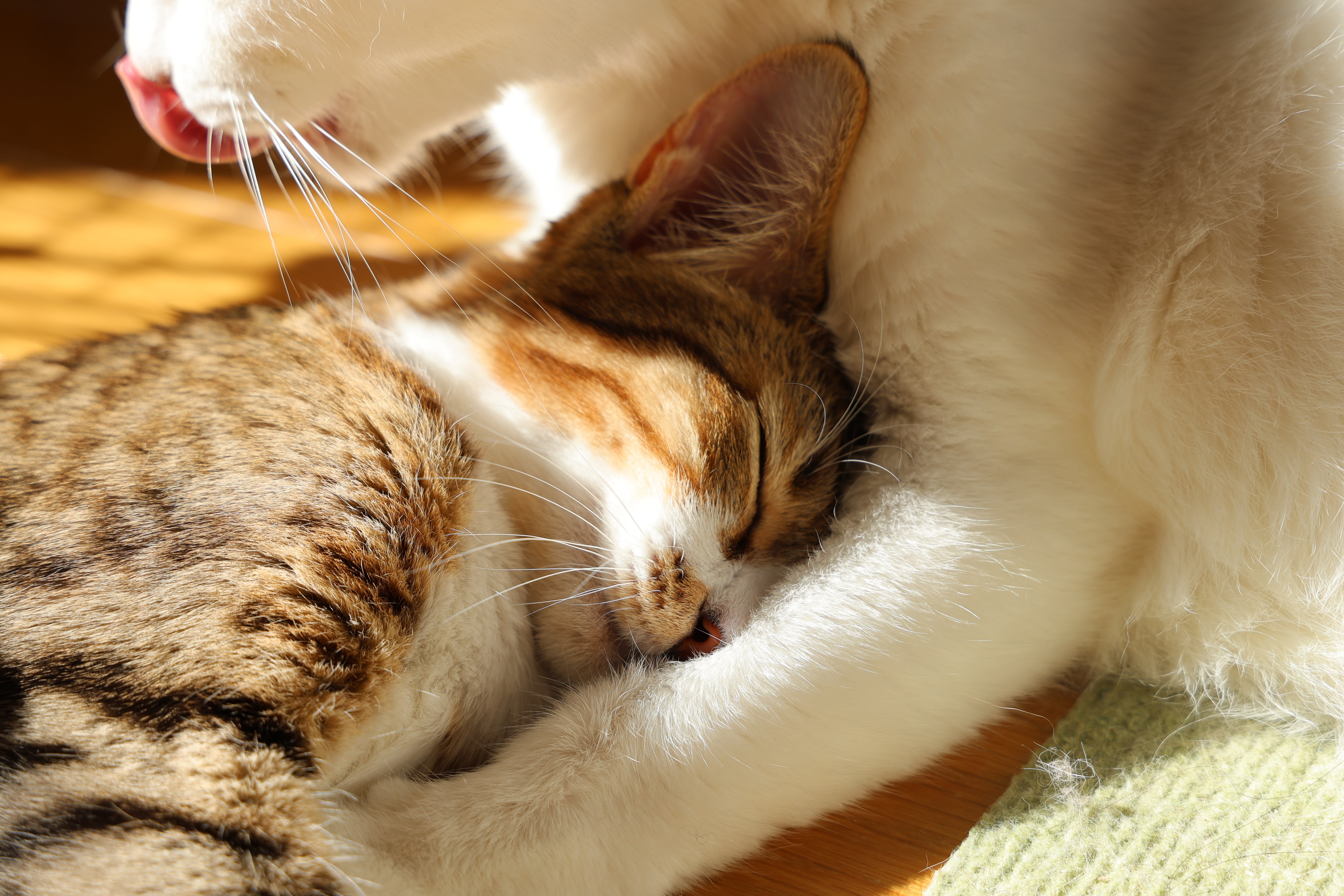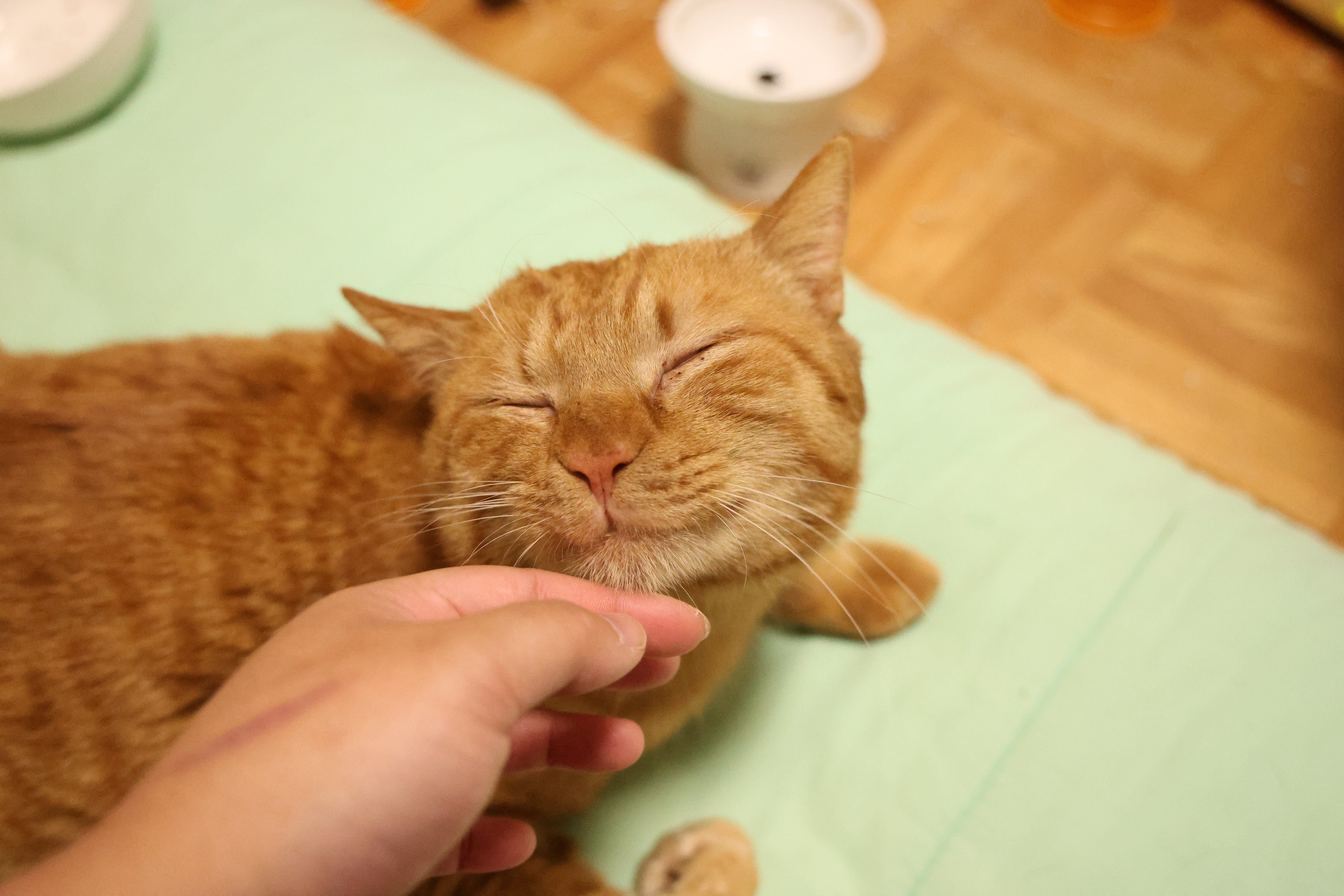 2025/12/28 18:112025年8月25日「地域猫が集う場所に生後2ヶ月くらいの子猫が捨てられたらしい」と連絡がありました。2ヶ月ならすぐ里子に出られるかなぁと、続報を待っていると「2ヶ月の大きさじゃない」と連絡が。写真を見ると、これは…まだ1ヶ月にもなっていないではないか…「とりあえず給水、それから保温を」「お水は飲ませた、保温も大丈夫」非常時用のストッカーから最後の1個のミルクと哺乳瓶を取り出し、虫かごにヒーターをつけてスタンバイ。ち、ち、ちいせぇ〜……生後2週間〜3週間くらい。ガリガリで骨と皮。到着時、1番大きい子だけ動いていて、あとは横たわって無言。「状態が微妙すぎる。もしかしたら厳しいかも。とにかく頑張ります。」ヒーターとミルクを用意して、動かない子から順番に排泄を促し、ミルクを飲ませ、ゲップをさせていきます。が、おしっこもほとんど出ない。ミルクもかろうじて5cc程飲むのが精一杯。「頑張れ。生きるんだよ。」慣れない哺乳瓶を嫌がる子猫たちに声をかけて背中をさすります。いっぱい動いて暴れて、ミーミー叫ぶ元気は出たみたいなので、次の哺乳まで寝かせます。どうか明日、1匹も欠けずにみんなで朝を迎えられますように…2025年8月27日子猫たちの我が家にいる間の名前が決まったので、今日撮った写真とともにお披露目します。今回、親と離されてからそれなりに時間があったのか、とても状態が悪かった4匹。「4匹揃って明日の朝を迎えられますように」と心から願い、不安の中 仮眠についたあの夜、恐る恐る呼吸を見て生死を確かめた次の朝、その朝に感じたことから名前をもらいました。「いぶき」は一番早く起きて、一番大きな声で鳴いていたので、この子の生きる気力というか生命力を本当に強く感じました。小学校の卒業公演の時に演奏した「生命の息吹」という曲から「いぶき」という名前をもらいました。(良い曲なので、機会があったらぜひ聴いてみてください。)「あさひ」は一番小さくてガリガリでした。我が家に来た時は129gしかありませんでした。通常健康な猫は100gで産まれてくると言われているので、様々な要因から産まれるのが小さかったのか、育つのが遅い子だったのでしょう。それでもいつも元気いっぱいで、少ないながらもミルクを精一杯飲もうとする姿が、太陽のように輝いて見えたので「あさひ」になりました。「ひので」は、あの早朝に玄関で見たオレンジ色の陽の光と、南向きの我が家から見える日の出は家に向かって左からのぼるので、模様からも着想を得て「ひので」になりました。「すずかぜ」は、夏の終わりに吹く涼しい風のことです。この子は最後まで起きてこなかった(というか起こすまで寝ていた)一番体の大きい子で、残暑が厳しい今年の夏も苦にせず、風のように我が家から里親さまの元へ駆け抜けて行くように、すずかぜという名前になりました。体重の推移 : 一昨日→今日いぶき 207g → 230g (+23g)あさひ 129g → 143g (+14g)ひので 198g → 213g (+15g)すずかぜ 279g → 274g (-5g)2025年8月28日体重の推移 : 昨日 → 今日いぶき 230g → 248g (+18g)あさひ 143g → 149g (+6g)ひので 213g → 231g (+18g)すずかぜ 274g → 304g (+30g)昨日まで前日比マイナスだったすずかぜが、シリンジに付けるタイプの乳首を購入したお陰で上手に飲めるようになり、劇的に体重が増えました。ひと安心です。いぶきは今日、初めてミルクを一度に11mL飲めました。なかなか8mLを超える量は飲めなかったので、日々成長しています。問題は、あさひ…体重は減ってこそいないものの、あまりに身体が小さく、成長も遅いです。今日は昼に6.5mL飲んだ以外は、一度に3mL程度しか飲みません。ミルクの温度を変えてみたり、濃さを変えてみたり、乳首を変えてみたり、いろいろやってみていますが、ダメです。かかりつけの先生、以前の小さい子は、飲めなくなったり体重が減ってきたら即入院だけど、ちょっとずつでも飲めて体重が増えているなら様子を見ましょうという感じでした。一応電話してみますが、たぶん「診てみないとわからない」と言われて、行ったら行ったで「入院するほどではない」と言われる気がして。たった149gのこの子を通院やカテーテルで振り回すのもなぁ…という感じです。まぁ電話するだけしてみましょう。素人には正解がわからないので。いつもぺっちゃんこだったお腹が、6.5mL飲んでぽんぽこりんになった記念日でしたが、体重の増えが思っていたよりイマイチで…昼間の歓喜はどこへやら。2025年8月29日あさひのミルクの飲みが悪く、体重があまり増えないのに加えて、ひのでが便秘になってしまったので、2匹を連れて病院に行ってきました。あさひは血液検査をしたところ、思っていたより数値がおかしいところは無く、気になるとすれば電解質(ミネラル)バランスが崩れているので、それを生理食塩水の点滴で調整しようということになりました。帰ってきてからはしっかり4.5mLのミルクを飲んでくれました。ひのでは