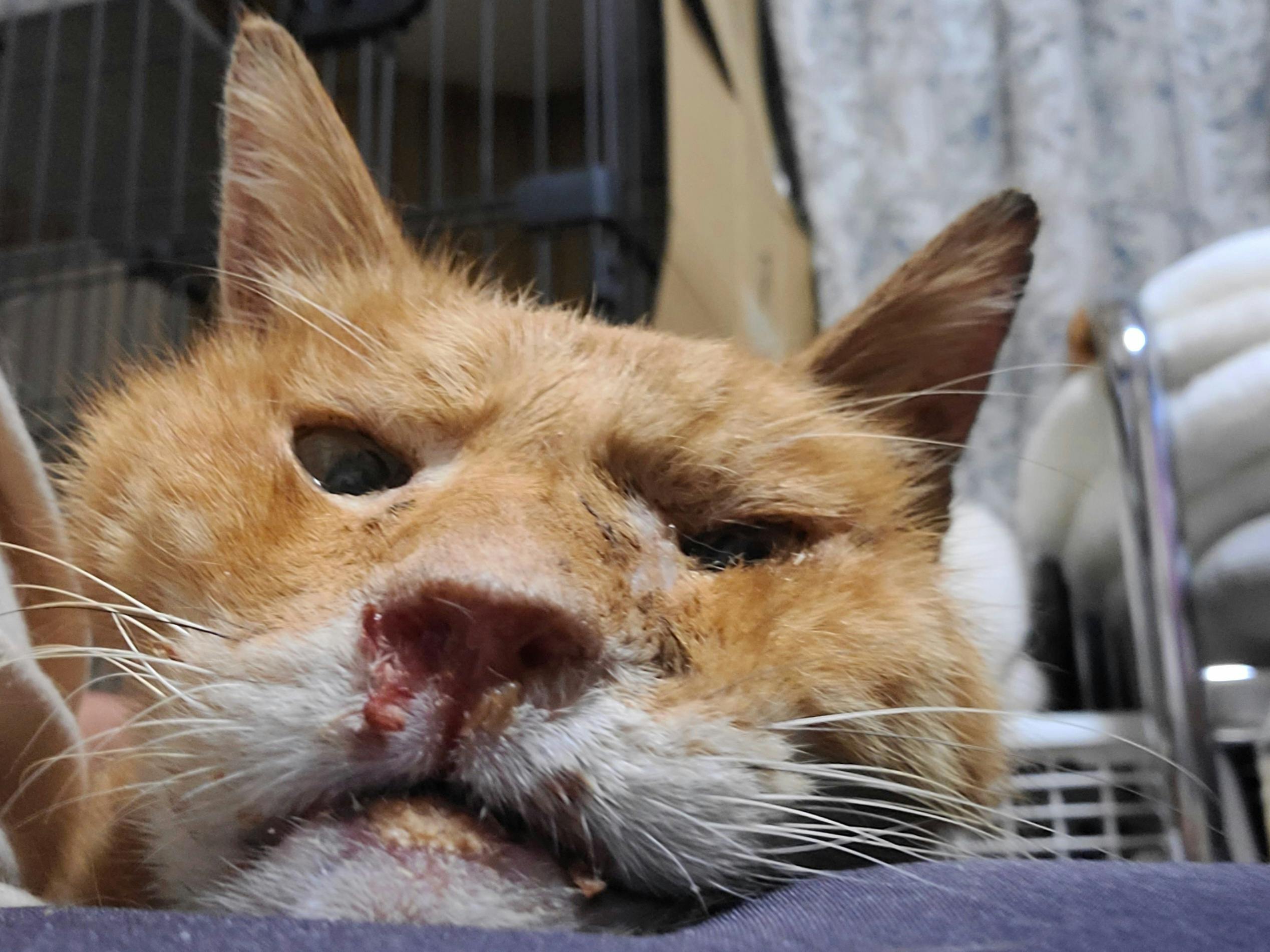 茶トラで、ボロボロ、ガリガリ、大量の目ヤニと、鼻水と鼻血が固まっています。