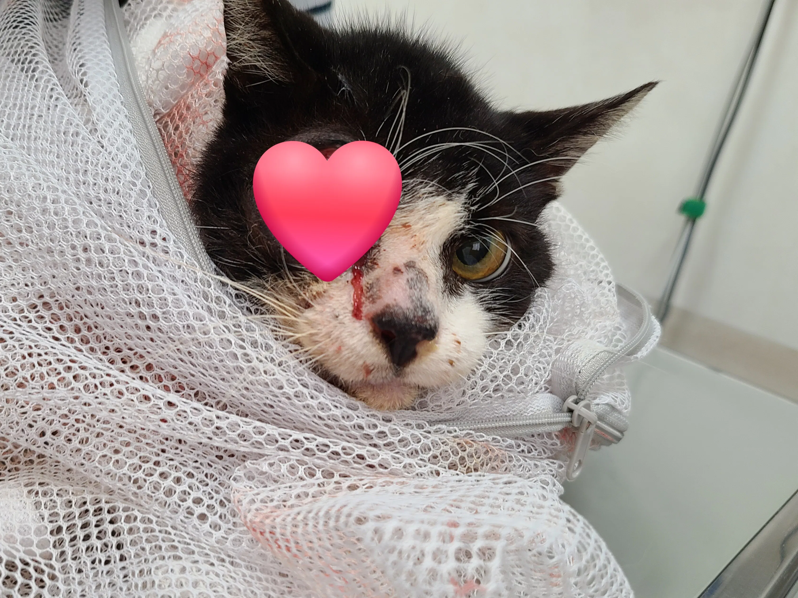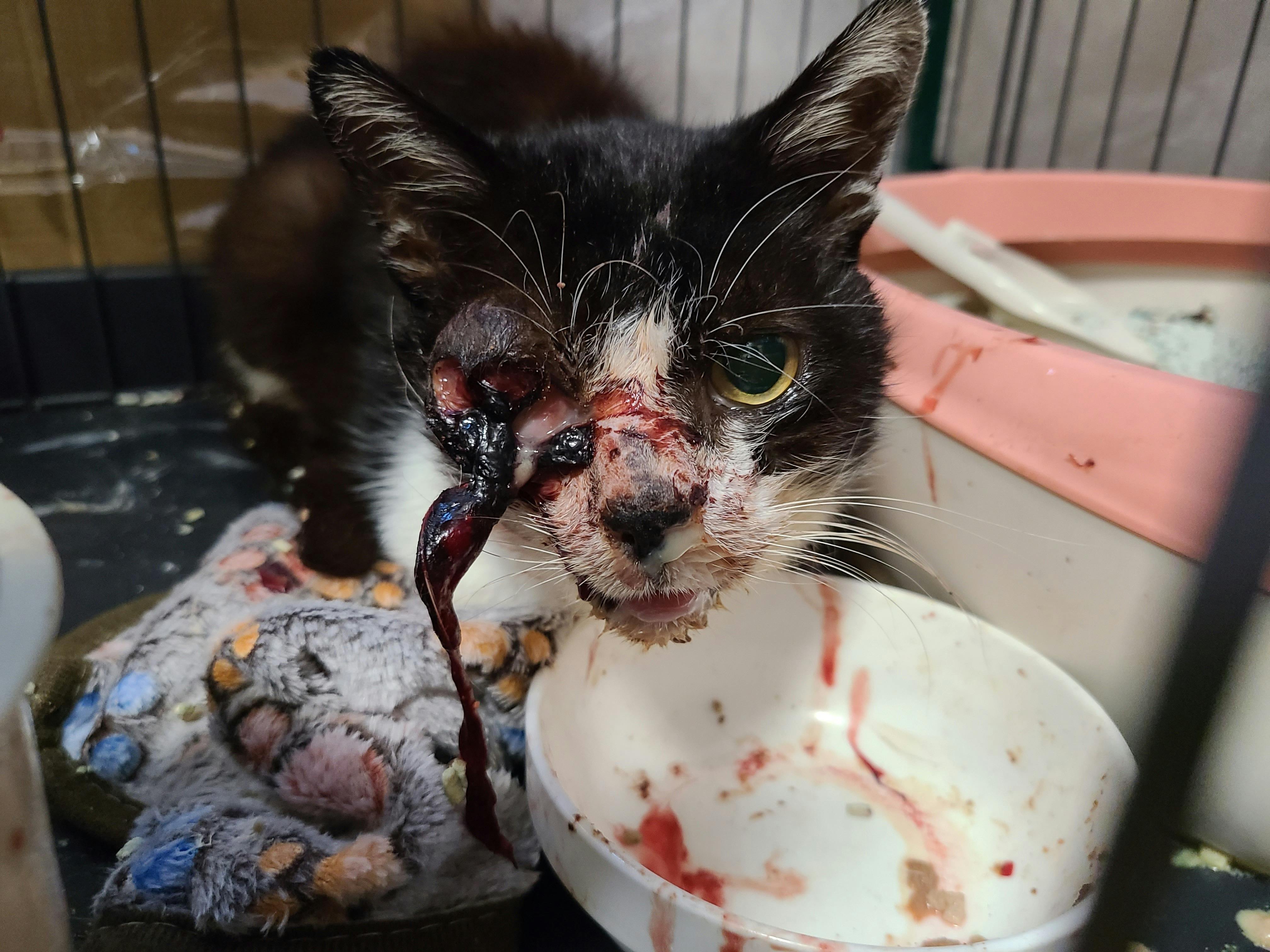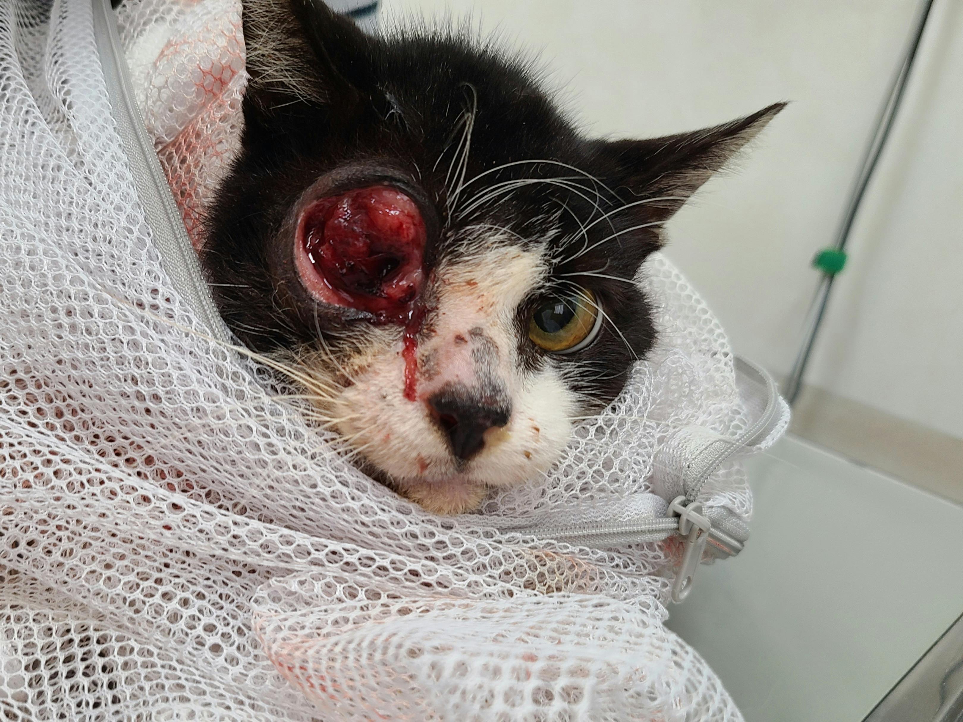 保護猫レミ、眼球が自壊して一部飛び出してしまい、緊急入院しました。