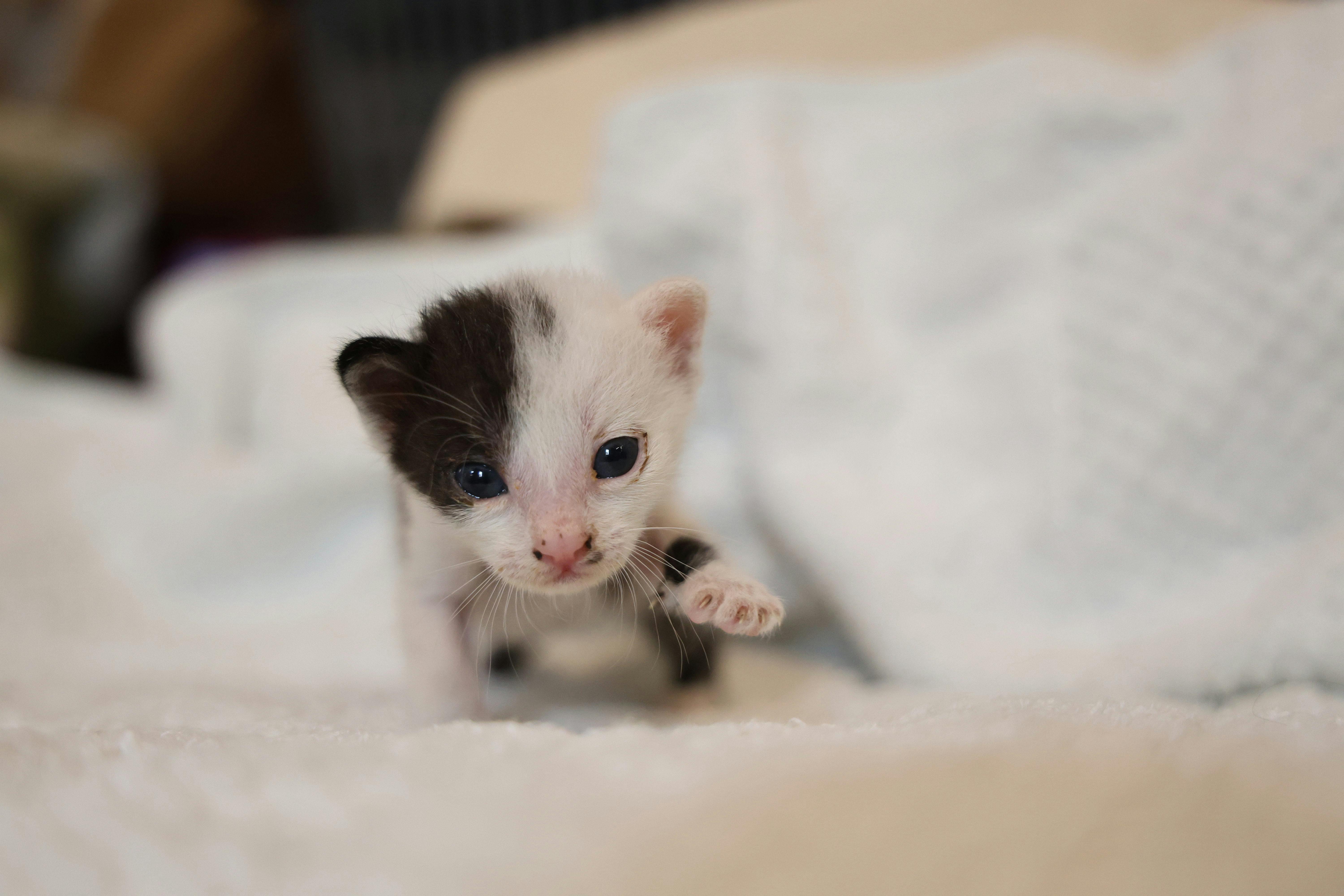 2025年5月26日ごみ箱に入っていた猫さん、名前は「しろろん」になりました。問診票を書いた時に、毛色の欄と間違えて、「しろ」と書いてしまい…保護活動の大先輩の愛猫さんのお名前を一部借りて「ろん」と付け加え「しろろん」になりました。ほんのすこーしだけ、目つきが穏やかになった気がしませんか?そんな気がするのは私だけかな…窓際のラックの上がお気に入りで、そこに毛布を敷いています。生きる気力が本当に感じられなくて、もう厳しいと思っていたのですが、主治医の先生の適切な医療のお陰で、だいぶ持ち直してきました。本当に枯れかけてただただ生きているだけの状態から、少しだけ生きる力を感じられるようになりました。通院を続けていますが、点滴の時はもう、大抵抗で七転八倒しています。今まで無抵抗・無反応だったので、少しは元気になったのでしょうか。相変わらず全然食べてくれませんが、先生がしろろんの顔を見て「だいぶ顔つき良くなりましたね!」と。食べていないので体重はまた減っていましたが、たしかに顔つきは明るくなってきたのです。食べていないとは思えないくらい。昨日から、ヒルズのa/d缶とロイヤルカナンの退院サポートを強制給餌であげています。昨日はとんでもない抵抗で、口に入れたものは全てヨダレと共に吐き出さないと気が済まないという感じでした。お陰で私の手にもいくつか穴が空きました。今日は爪切りして再挑戦。なんと吐き出したのは5cc程度で、残りの20cc程は全て吐き出さずに自力で飲み込みました。すごいよしろろん!お利口さん!よく頑張った!えらいよ!褒めて抱き締めると、白濁して見えない目で一生懸命、私の顔を見ようとしていました。ずっと伏せていた姿勢も、ゴロンとひっくり返って寝るようになりました。少しは安心出来る環境だと思ってくれているのかな…まずは自採(自力で食べること)が出来るようになるまで、全力でサポートします。2025年5月28日しろろんが、しろろんが自力でご飯を食べました(大泣き)もう、私は、嫌がるしろろんに強制給餌をしながら、あと少し頑張ろう、生きるんだよ、頑張ろう、と声をかけながら、正直こんなことして、しろろんのためになってるのかなと思いました。強制給餌の準備をする度に身構えて固まるしろろんを見て、目が見えなくてもしろろんにとって怖い音がしているんだと…強制給餌が終わってから震えるしろろんを抱き締めて、ごめんね、ごめんね、ごめんなさい、本当にありがとう、頑張ってくれてありがとうと声をかけて、もうこんなことしなくてもこの子の好きなようにさせたらいいんじゃないかと、心折れそうになっていました。さっき強制給餌の前に、カルカンパウチと銀のスプーンのパウチをみんなに配っていました。そしたらラックの上にいたしろろんが、今まで自分からご飯タイムに参加したことがないしろろんが、にゃあにゃあと可愛い声で鳴いて、こちらに来ようとしました。もしかしたら食べてくれるのかもしれないと思い、気が変わる前にと急いでカルカンパウチと銀のスプーンのパウチをお皿に入れたら、目が見えないのにお皿の元へ走って来ました。それで、あっという間に4袋、たいらげてしまいました。食べ終わってから、ありがとう、ありがとうとしろろんに言って泣きながら撫でました。不思議そうな顔をして、見えない目でじーっとこちらを見ていました。それから私の膝に、スリーッと頭をこすりつけました。しろろん、ありがとう。こんな状態になるまで生きていてくれて、ありがとう。また生きようと思ってくれて、本当にありがとう。思えば我が家に来て初めて隔離部屋で食べたのが、カルカンパウチと銀のスプーンのパウチでした。覚えていてくれたのかもしれません。