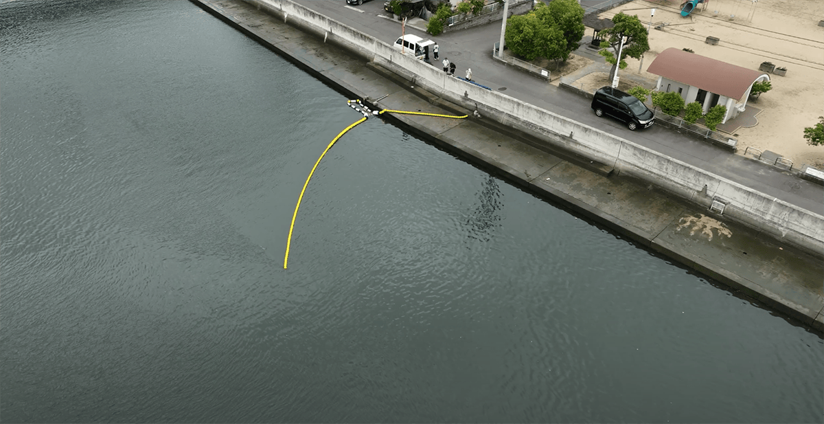 「kawasemi」は、漁網とフロートを使用した回収ポケットにフロートを使用したせき止めウイングを組み合わせた、全長15 mの回収装置です。