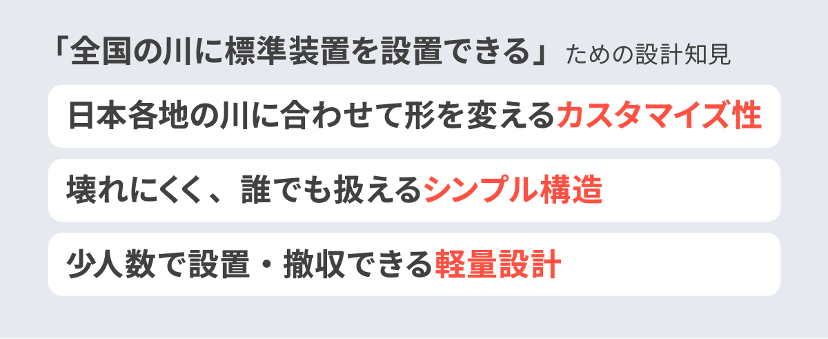 私たちが目指しているのは、 全国どの川にも、数日で設置できる“標準インフラ”です。
