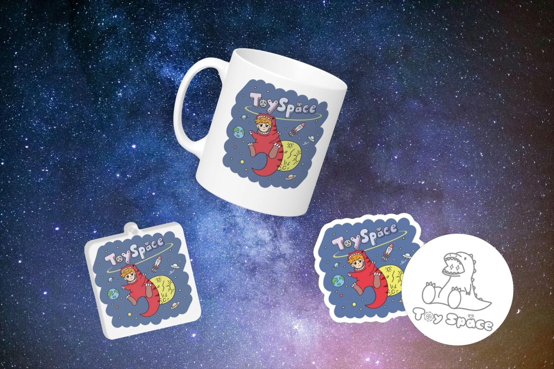 ②今回の企画『きょんとおもちゃを作ろう』で特別に作ったロゴ『Toy Space』が描かれたTシャツ ・宇宙をイメージに、文字におもちゃ要素を足して作られたデザイン