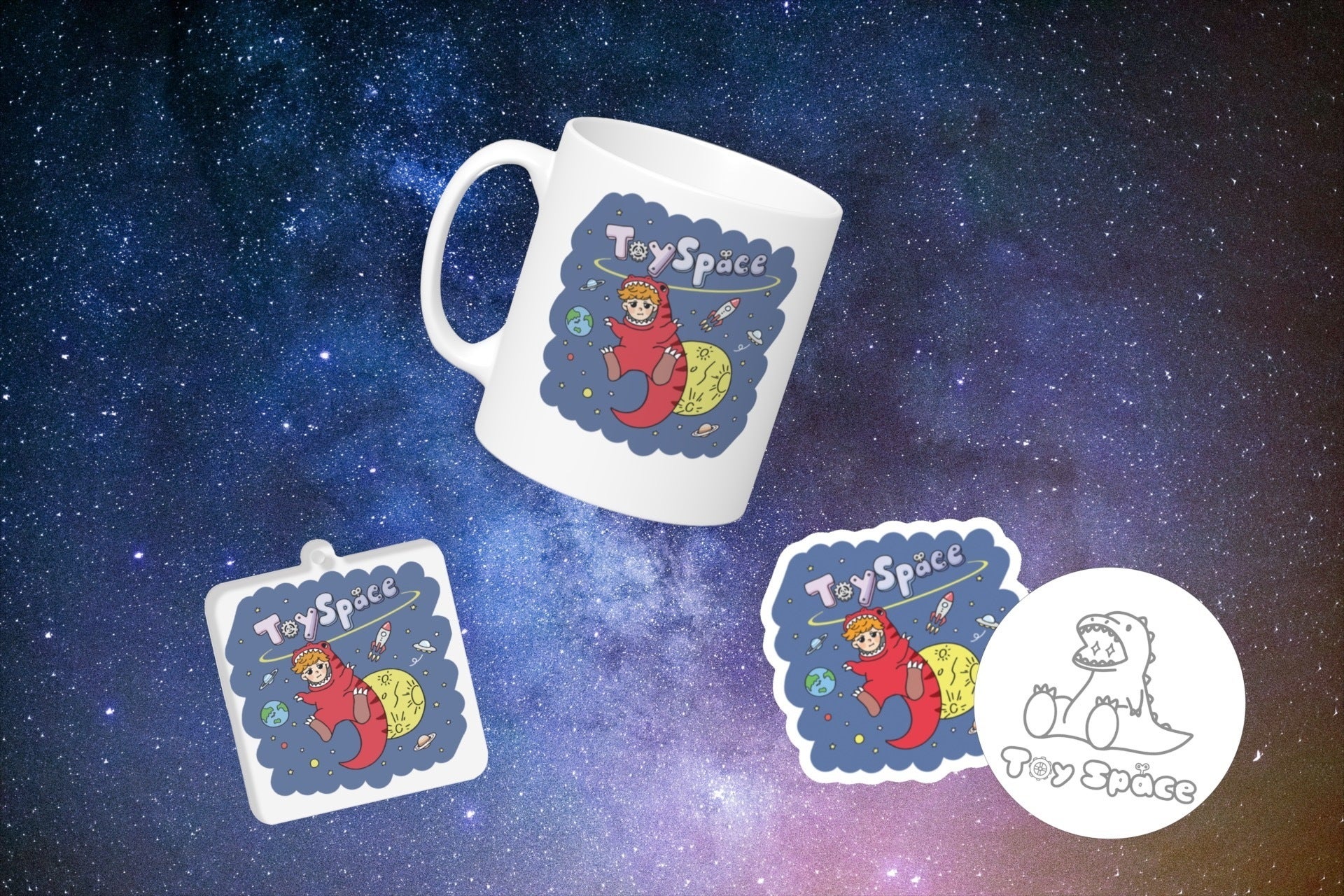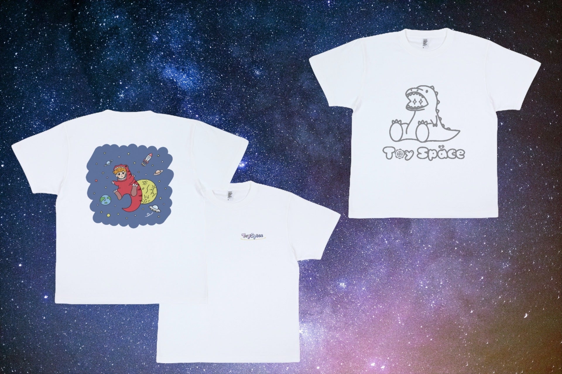 ①恐竜を被っておもちゃ化したきょんが、宇宙で浮いている。 『宇宙に自由なおもちゃを届けていく』をテーマに描いたTシャツ。