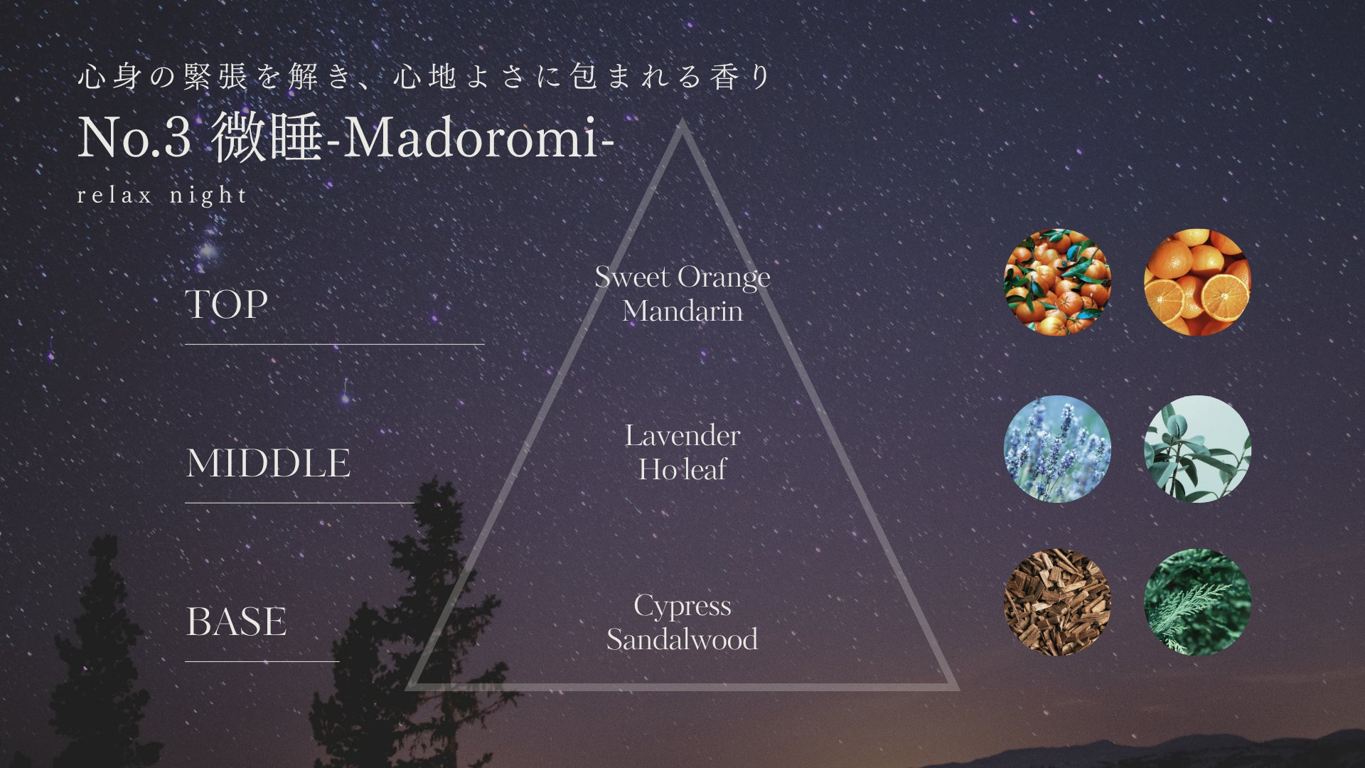 一日の終わりに心地よい眠りへと誘う、深いリラックスを求める時におすすめのブレンド。