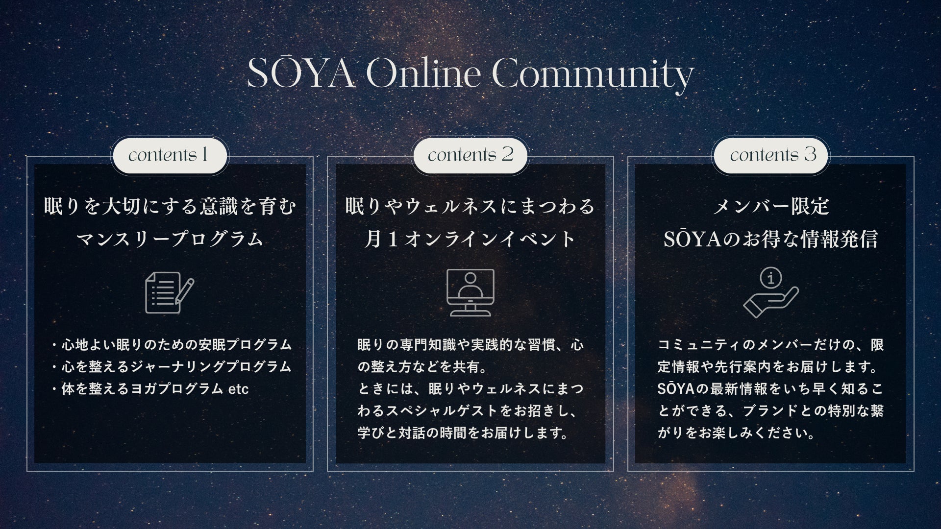 商品と共にSŌYAオンラインコミュニティへの招待状(参加無料)を同梱させていただきます。
