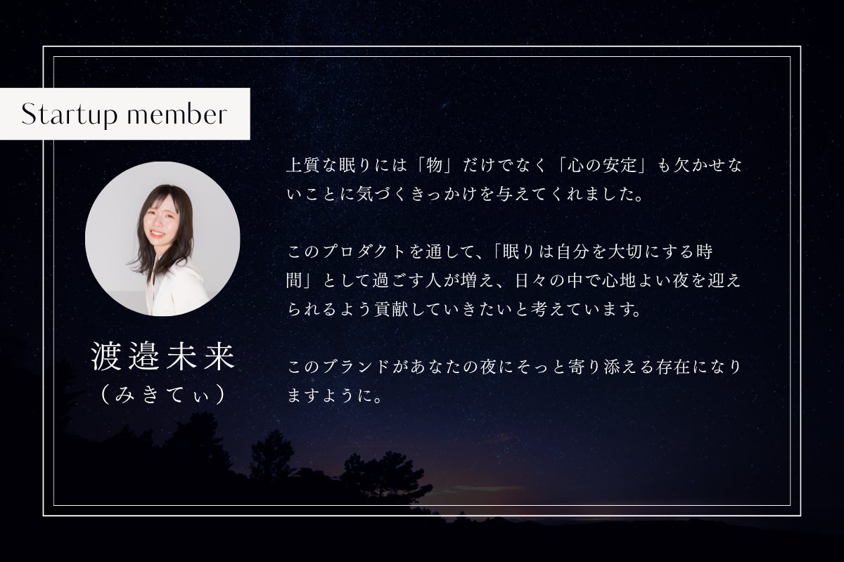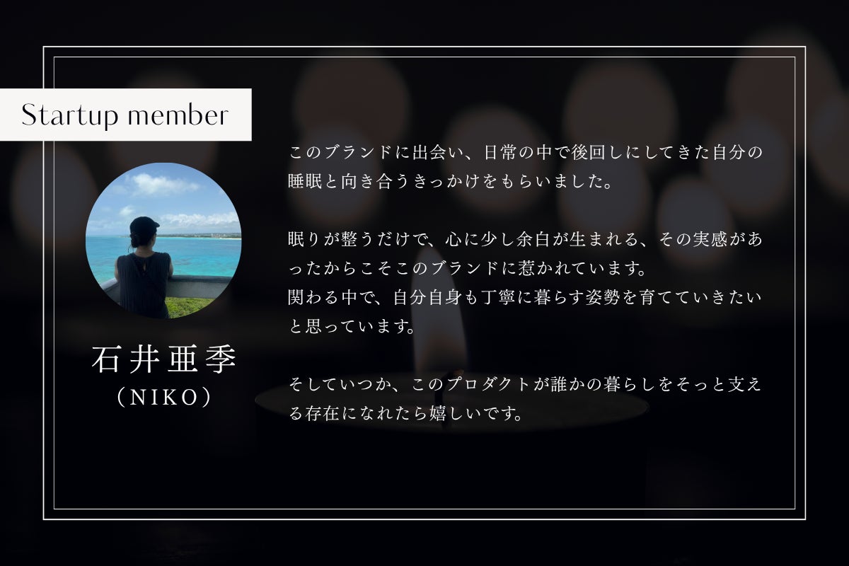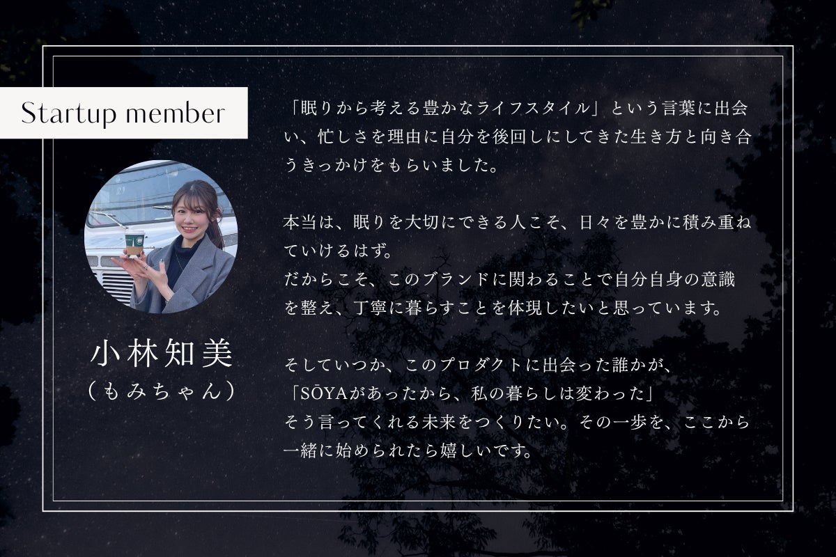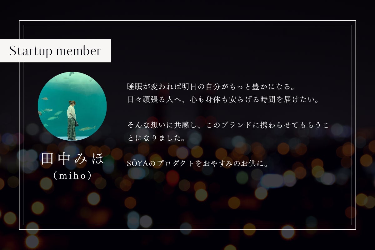 商品を使用して楽しむだけでなく、SŌYAの世界観や“眠りを大切にする暮らし”を仲間と共に、より深く体験していただけたら嬉しいです。