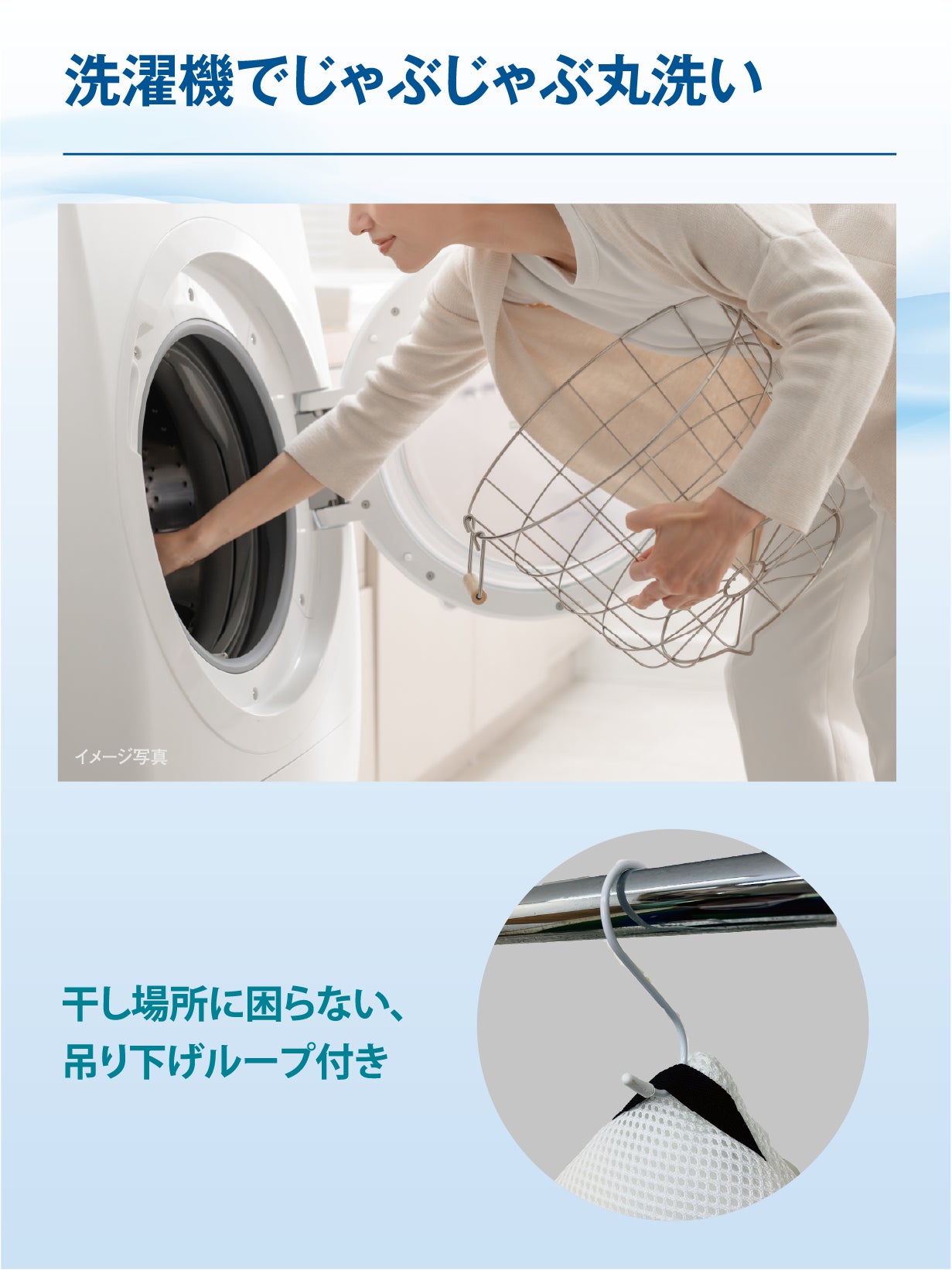 ・洗濯機をご使用の際は、必ず洗濯ネットに入れ十分水に沈めてから開始してください。