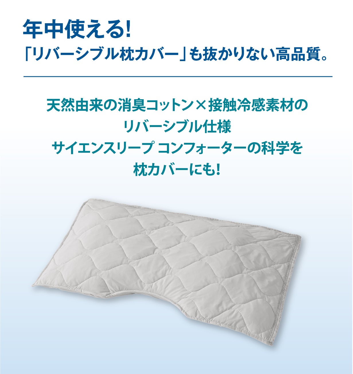 A. 片面は冷感素材、もう片面は消臭機能付きの天竺ニットを使用したリバーシブル設計です。通年快適にお使いいただけます。